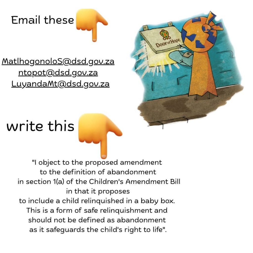 Despite the Gauteng Department of Social Development’s attempts to criminalise Baby Savers, not to mention a court order allowing operations until January 2026, Jones called for public objections before Saturday 25 October to protect these life-saving services that provide safe, anonymous relinquishment and prevent unsafe infant abandonment.