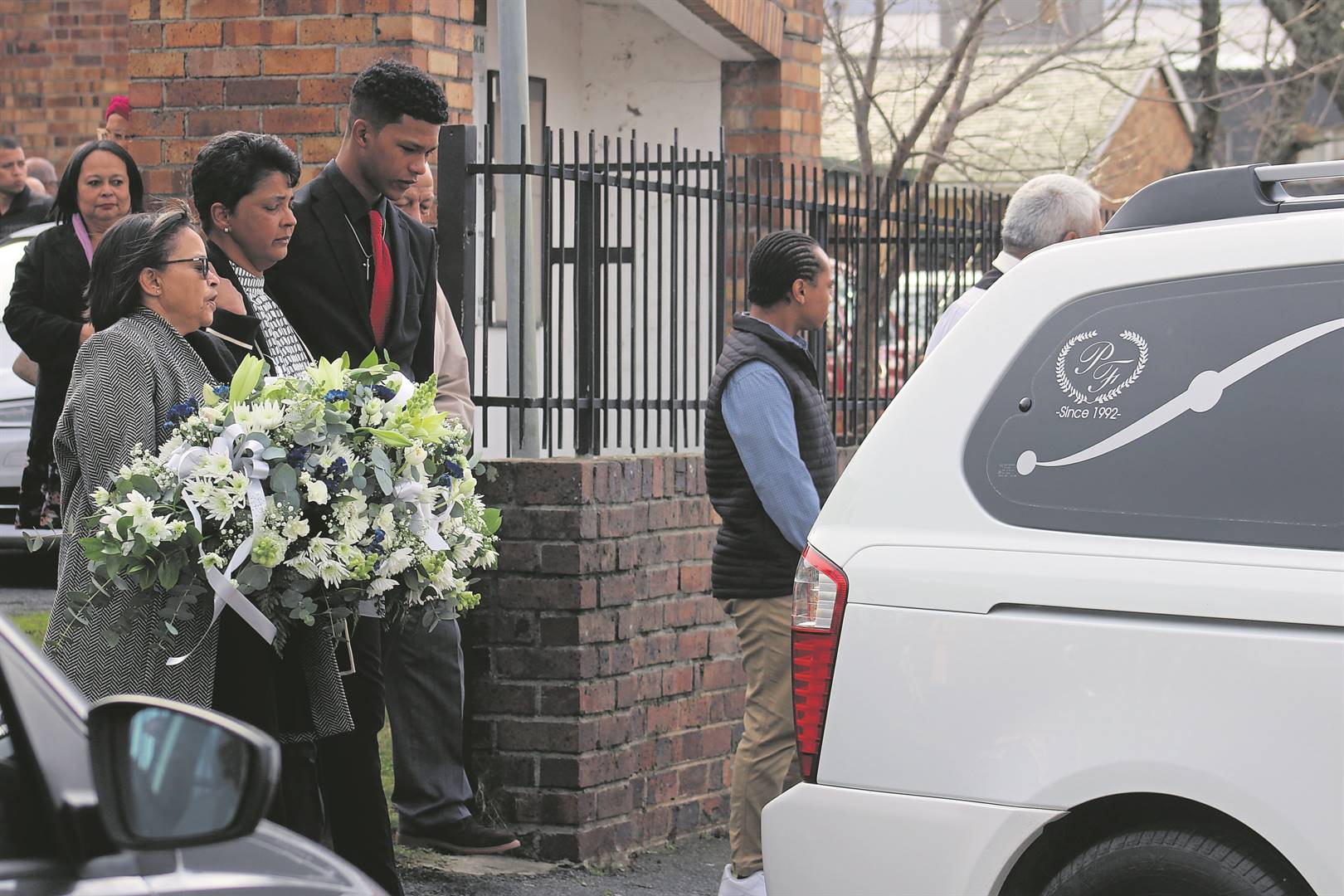 ’n Bedroefde Rozanne en Wesleigh Mentoor neem finaal afskeid van die geliefde eggenoot en pa terwyl die lykswa die kerkterrein in Oakstraat, Somerset-Wes, verlaat.