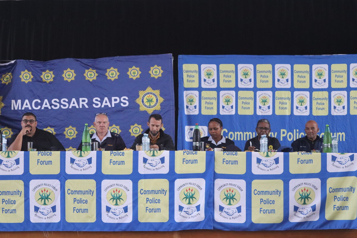 Die Macassar-gemeenskapspolisiëringsforum (GPF) het verlede Donderdag (8 Mei) ‘n polisie-imbizo aangebied. Die Imbizo was daarop gemik om veiligheid in Macassar te verbeter. Edward Visagie, die voorsitter van die Macassar-GPF, het verskeie veiligheidsteenwoordigers verwelkom en op die openbare vergadering het die paneel kwessies oor veiligheid in Macassar bespreek. Die paneel (van links) was Peter Helfrich, lt.kol. Arnold Roux (stasiebevelvoerder), Reagen Allen (lid van die provinsiale parlement), brig. Khuthala Masakala, Marlon Solomons en Dean Rulse. Foto’s: Barend Williams