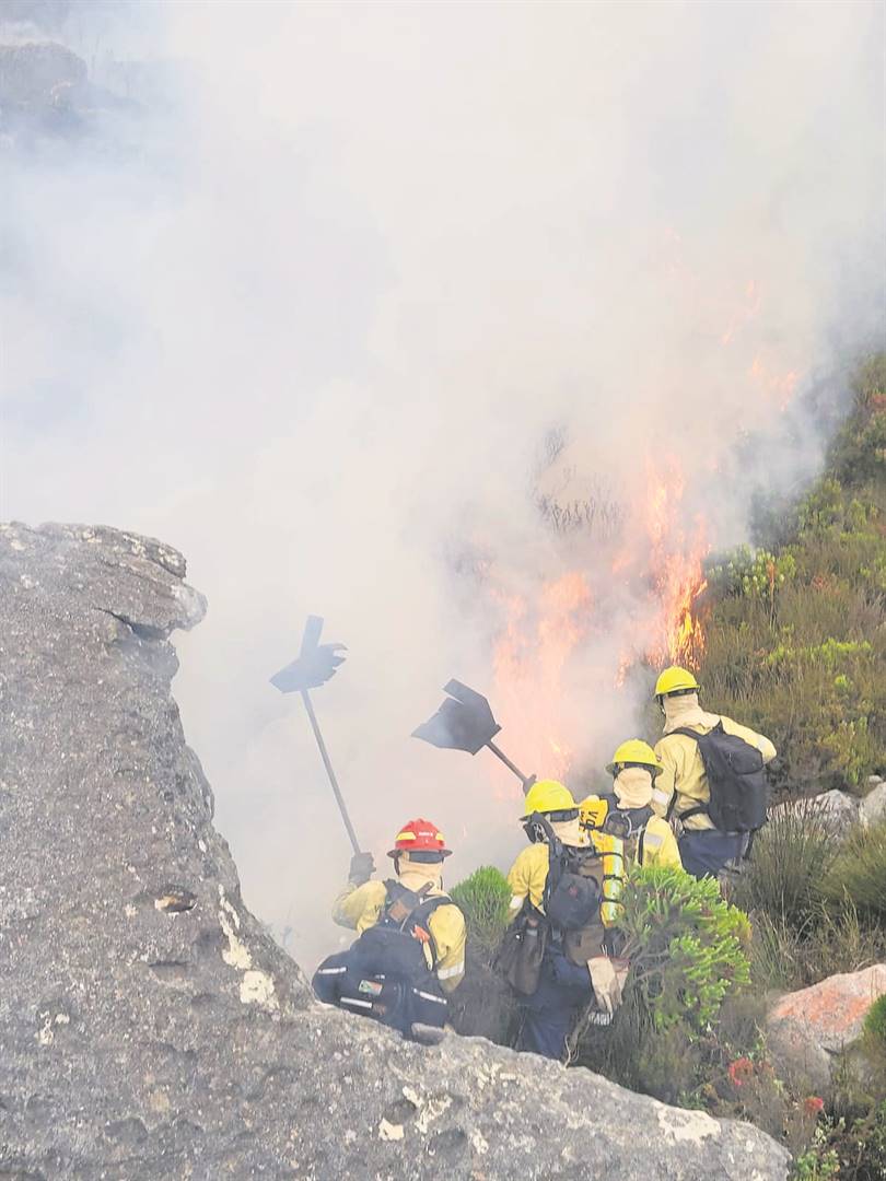 Brandbestryders werk hard om die brand langs Hans se Kop in bedwang te bring. FOTO: Incident Management Teams
