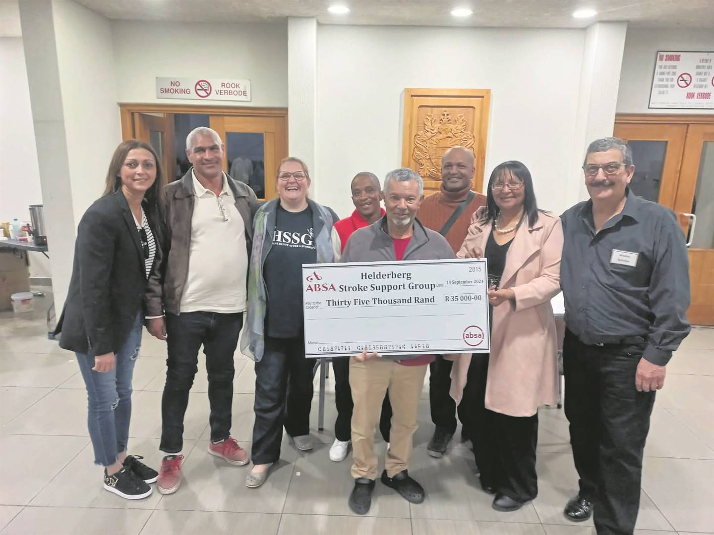 A cash cheque of R35 000 was donated to the Helderberg Stroke Support Group (HSSG), which was the grateful beneficiary of the fundraising “Music Beats the Heart” show featuring renowned saxophonist Don Vino, who stepped up to the local stage alongside industry friends on Saturday 14 September (“Beats for hearts in Town Hall,” DistrictMail & Helderberg Gazette, 21 August). Pictured at the cheque handover (from left) are Adele Gordon, Lewis Leybrandt, Claudia Andrews (HSSG CEO), Christopher Hendericks, Nicholas Etson, Theresa Etson, Wesley Schuller and Daniel van Heerden.
