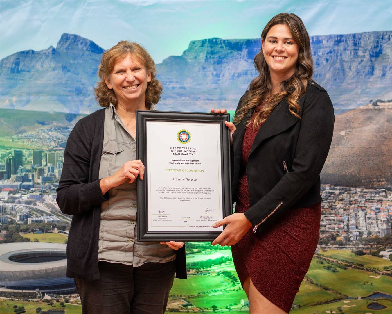 Among the group of graduates awarded was Celmari Pieterse (right) who is based at Helderberg Nature Reserve in Somerset West. Pieterse satisfactorily concluded the rigorous training programme and successfully completed all required on-the-job-training as an EPWP Project Trainee Level 2 for the Kader Asmal Skills Development Training Programme.