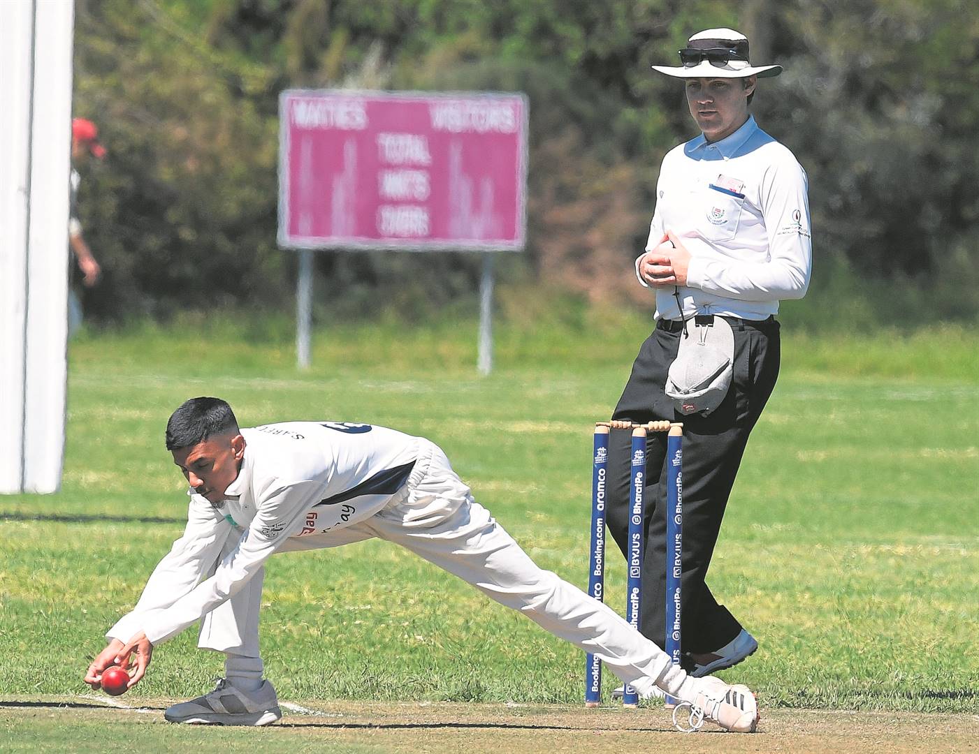 Shameel Abels of HHCC gets in some fielding off his own bowling.