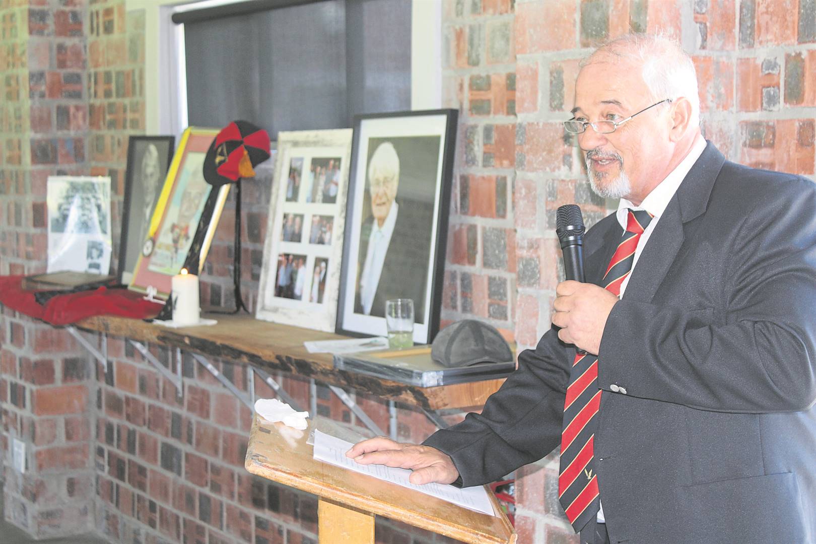 Voorsitter van Helderberg-rugbyklub, Bokkie Carstens, het rouklaers by die gedenkdiens toegespreek.Foto’s: Yaseen Gaffar