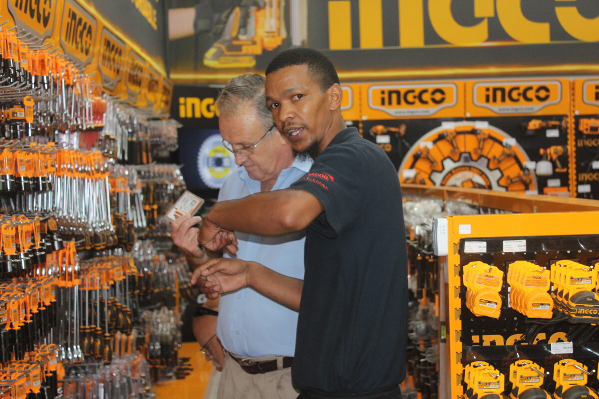 Pictured at the launch (from left) are Dirk Viviers (Timbuild managing director), Pierre Steyn (Ingco SA brand ambassador), Tim the Timbuild mascot, and Stefan Gouws (Ingco). Photos: Jamey GordonRuan de Wet provided excellent customer service to shoppers exploring the newly opened Ingco in-store concept. Staff members Jay-Reen Wakens, Charles Chidothi, Ryan Rodgers, Nadeen Uys, Brendon Manie and Mark Links delivered the outstanding customer service that has made Timbuild a trusted local hardware destination.Johan Gouws and Johann Coetzee at the launch of Timbuild’s new Ingco in-store concept.