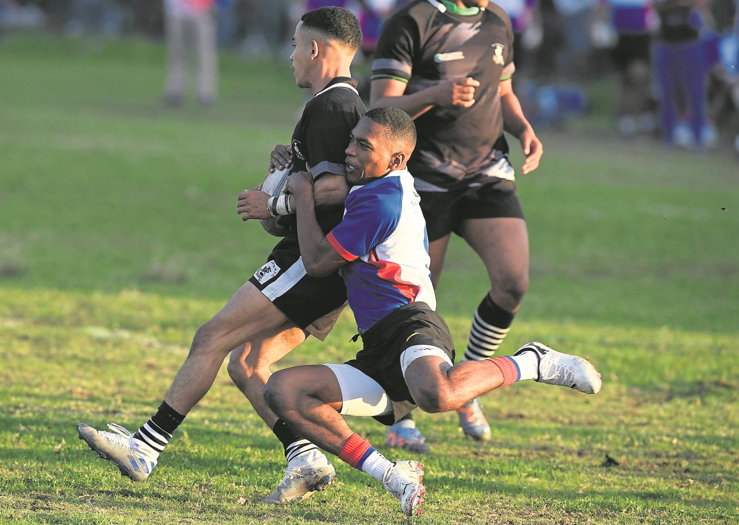 All Saints turned the tables and after a wave of attack in the Strand half, scored in the corner through hooker Ashley Warrie. Saints managed another try by prop Leodine Latief, this time converted by centre Aiden January. Strand kept its first-half score alive through penalties by Keanu Cyster, while January also slotted a penalty kick for Saints to end the half at 3-15.