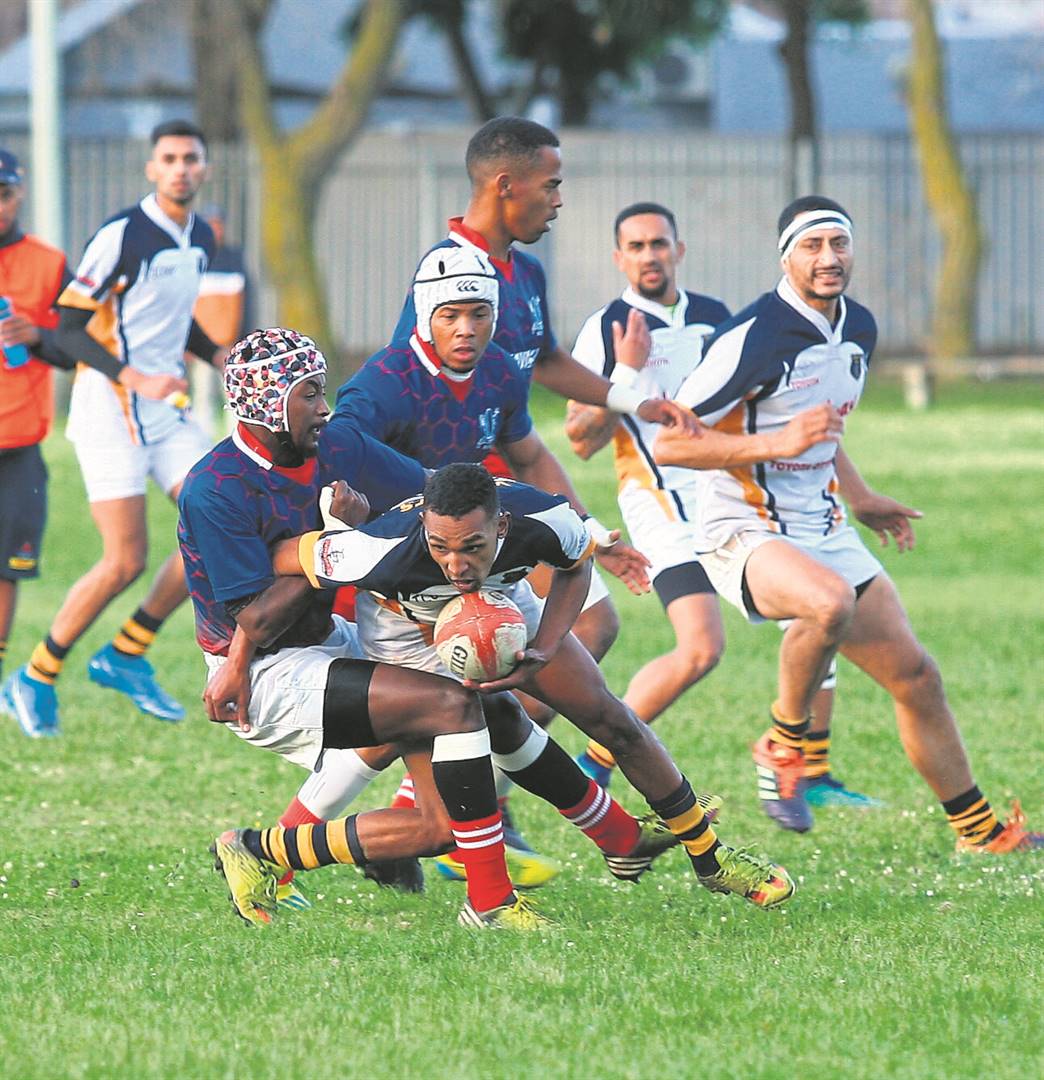 Ebrahiem Jacobs of Violets RFC is stopped in his tracks by Eric Laka of Sir Lowrians RFC during a Western Province Rugby Football Union promotional top-nine league encounter played in Lansdowne this past Saturday (23 July). The Helderberg visitors narrowly missed out on victory following a good second-half performance, going down 15-12 to a spirited Violets side.Photo: Rashied Isaacs