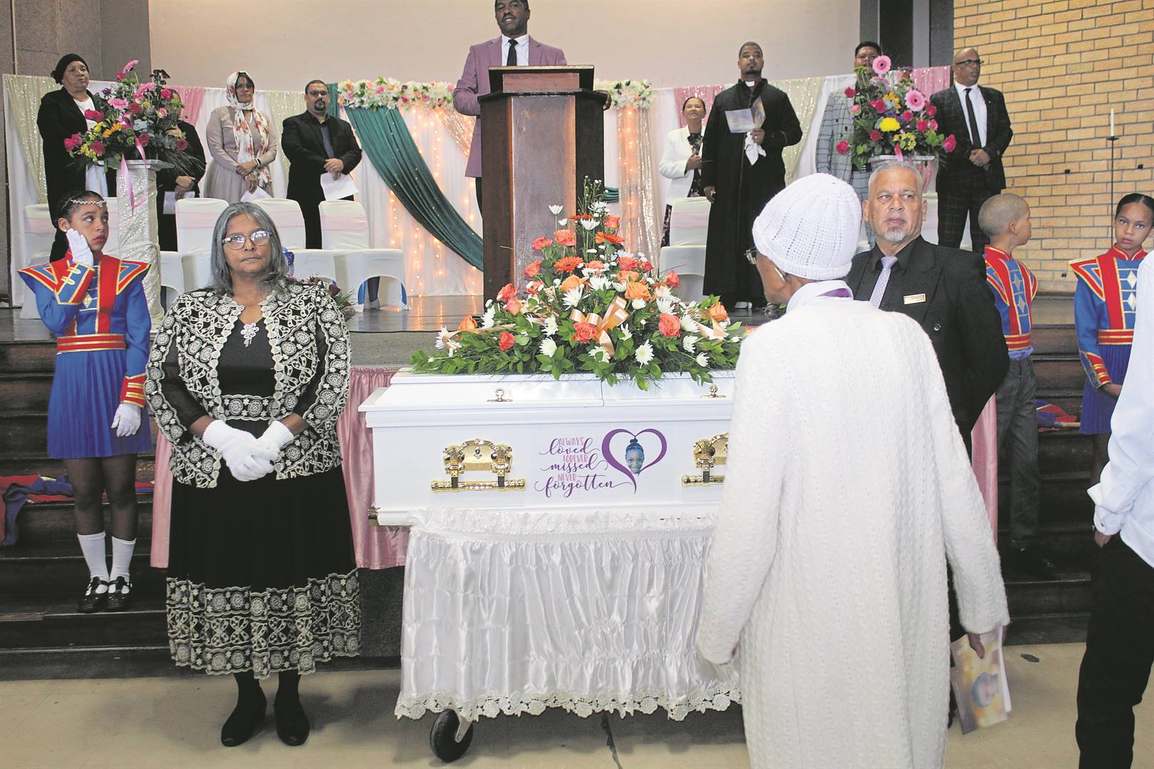 Die begrafnisdiens is voorafgegaan deur ’n staptog van Marvinpark Primêre Skool tot by die skoolsaal waar talle rouklaers hul laaste eer aan die geliefde kind betoon het. Die begrafnisdiens is deur die laerskool se Randall Olsen gelei en die eerste spreker aan die woord was die Wyk 109-raadslid Peter Helfrich, wat as een van twee sprekers op die program eerste aan die woord was.