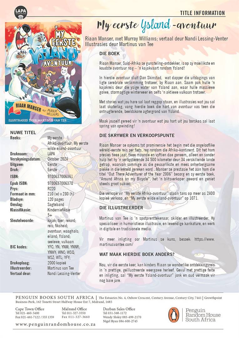 Die boek, geskryf saam met bekroonde joernalis Murray Williams, voltooi Manser se trilogie van betowerende kinderavonture. Die reeks het begin met “My eerste Afrika-avontuur” (2022, SA Boek van die Jaar 2023), wat sy reis per fiets deur 34 Afrikalande gevolg het, en het voortgegaan met “My eerste wilde eiland-avontuur” (2023), wat sy solo-kajakreis rondom Madagaskar beskryf het – beide wêreld-eerste.
