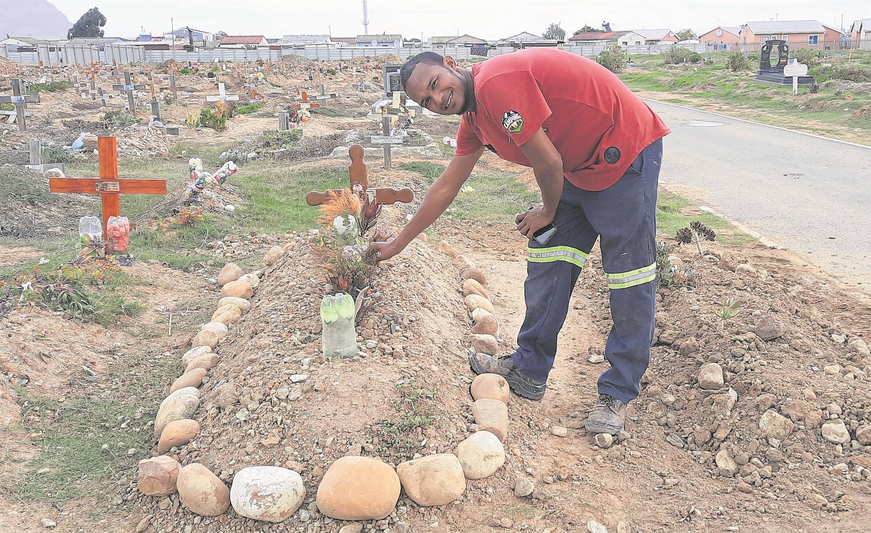 “Mense kontak my gereeld en vra vir hulp. Dan vertel ek hulle wat ek doen en dat dit R250 kos om die graf op te vul en my eie bottels en klippe op die graf te pak.” Hy vra egter ekstra geld om die kruise oor te doen en vertel mense het eintlik planne van die munisipaliteit af nodig as hulle grafte met bakstene en sement wil bou.
