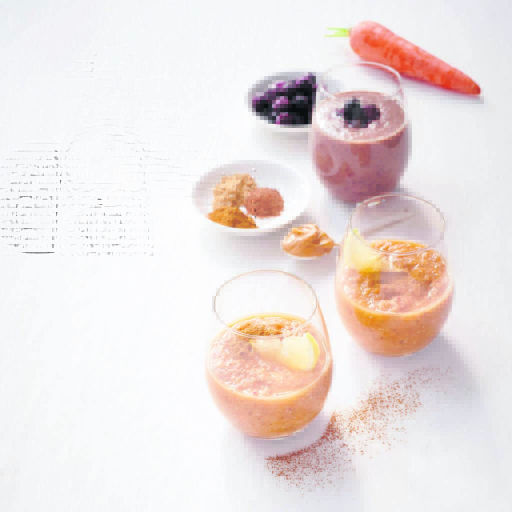 Peanut butter and blueberry smoothie: Replace the carrot and pineapple with another small banana and ½ cup (125 ml) frozen or fresh blueberries. Blend as above with 2 tbsp (30 ml) peanut butter (with no added salt or sugar) and 50 ml strong Rooibos tea. Garnish with more berries and ground spices. Makes 500 ml, to serve: two portions.