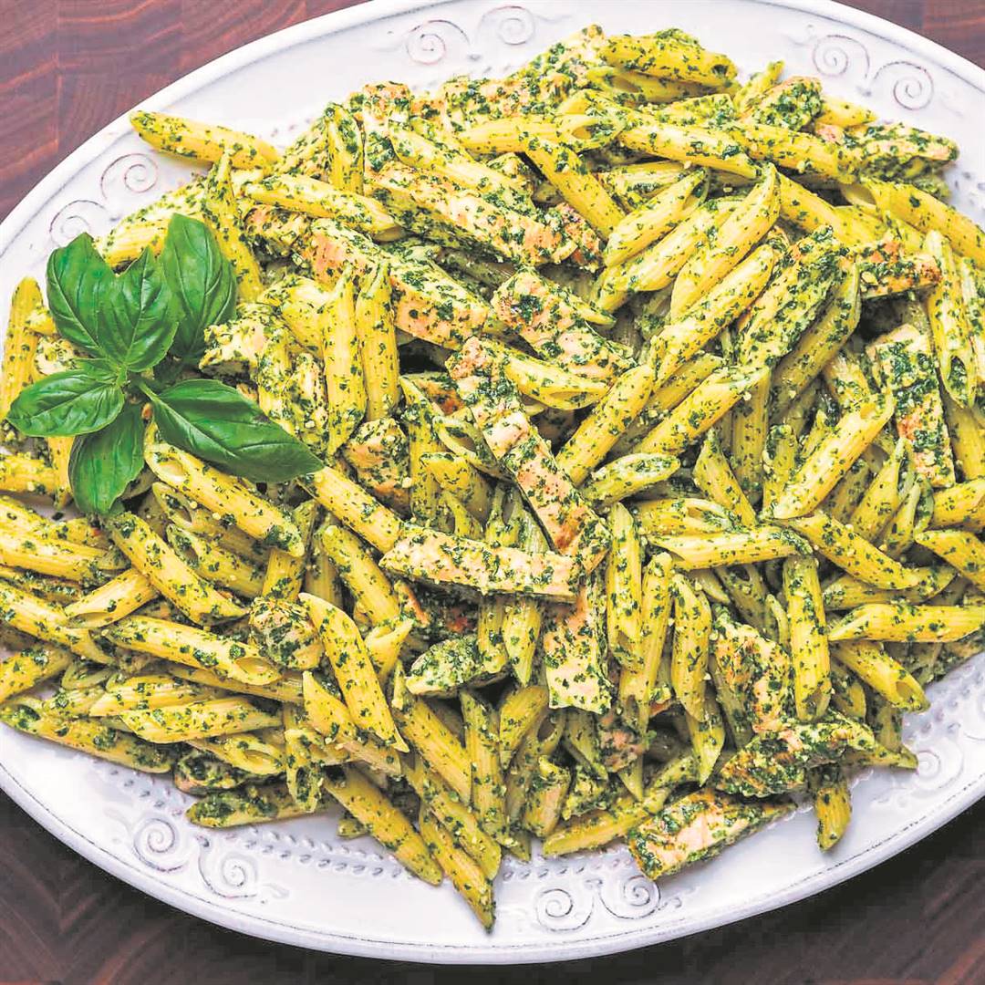 For the chicken: Soak the chicken in lemon juice for about an hour. Pat dry and set aside. In a pestle and mortar, grind the rosemary, thyme and a garlic clove adding 20 ml oil to create a smooth paste. Rub all over the chicken then grill or pan fry the chicken until cooked through. Slice into pieces and lay over the pesto pasta and finish off with grated parmesan.