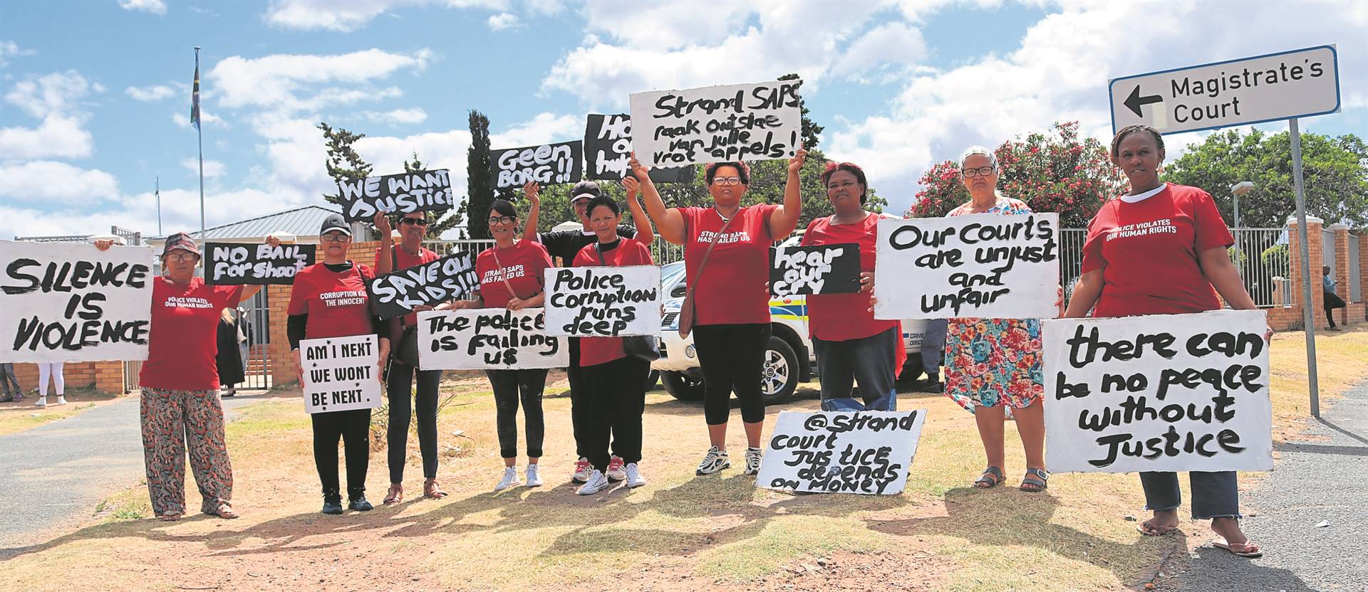Die voortslepende bendegeweld in Strand het die Strand Community Concern Group die afgelope Donderdag (14 Desember) genoop om besoeke af te lê aan die Strand-polisie sowel as die Strand-landdroshof om hul misnoeë uit te spreek oor onskuldige mense wat hul lewe aan die hand van bendes verloor. Memorandums is ook aan die hof en die polisie oorhandig, want die groep is ontevrede oor die reg- en strafstelsels wat na hul mening die inwoners van Strand faal. Die groep het ook aan ’n vreedsame betoging onder die wakende oë van die openbare orde-polisie deelgeneem. Op die foto ver regs staan Zorah Motasi, die stigter van Vroue in Aksie-beweging, wat ook deel is van die groep saam met vroue van Strand wat moeg is vir misdaad. Foto: Rick Marais