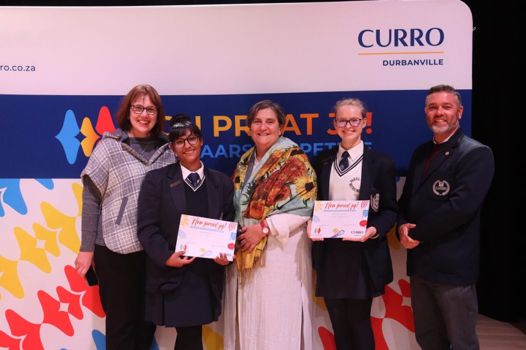 Tyra Ross and Anya Rosenstrauch of Parel Vallei High School in Somerset West secured second place in the Senior Afrikaans Eerste Addisionele Taal category at the inaugural Nou Praat Jy! national speech competition. The contest, hosted at Curro Durbanville High School last Wednesday (25 June), challenged learners to present Afrikaans speeches in pairs under the theme “Afrikaans โ€“ ‘n taal van kleure en klank,” commemorating 100 years of Afrikaans as an official language. The unique duet format emphasised teamwork and natural dialogue, distinguishing it from traditional debate competitions. Against strong competition from across various provinces, Tyra and Anya’s presentation impressed judges with its spontaneity, clarity and meaningful connection to the centenary theme. Pictured (from left) are Marรญ Lategan (deputy CEO for Curro Holdings), Tyra Ross, Isa Swanepoel (Curro Durbanville High School principal), Anya Rosenstrauch, and Riaan Stroebel (executive head of Curro Durbanville).
