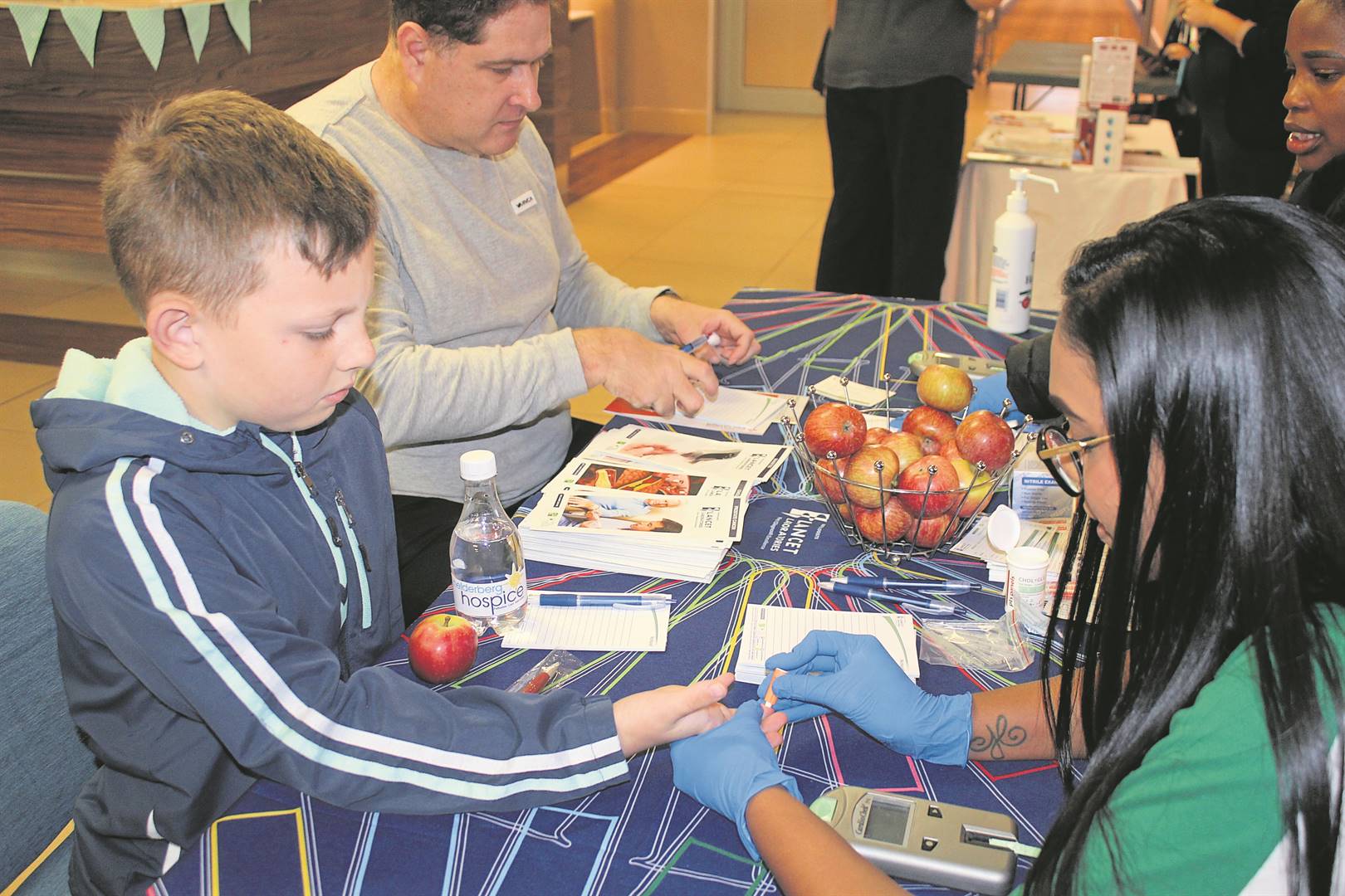 Hospital manager Blake van Aswegen and his son Justin took the opportunity to get their blood glucose levels tested at the Lancet Laboratories stall which was manned by the friendly representatives, Pam Mthwa and Roxanne Naidoo.