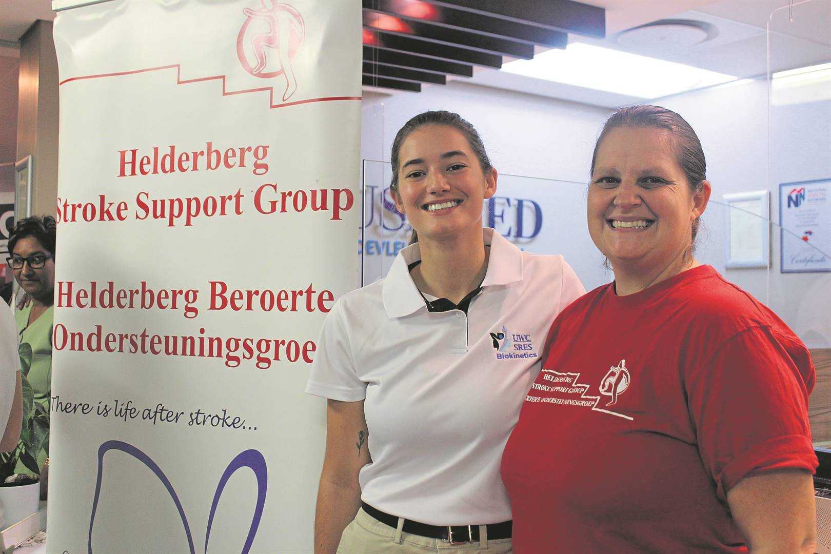 Claudia Andrews raised awareness on the invaluable services offered by Helderberg Stroke Support Group. Pictured with Andrews is Gaelle Geeraert, one of a few Biokinetics students of the University of the Western Cape who joined as part of a collaboration between the community organisation and the institution and offered free blood pressure tests.
