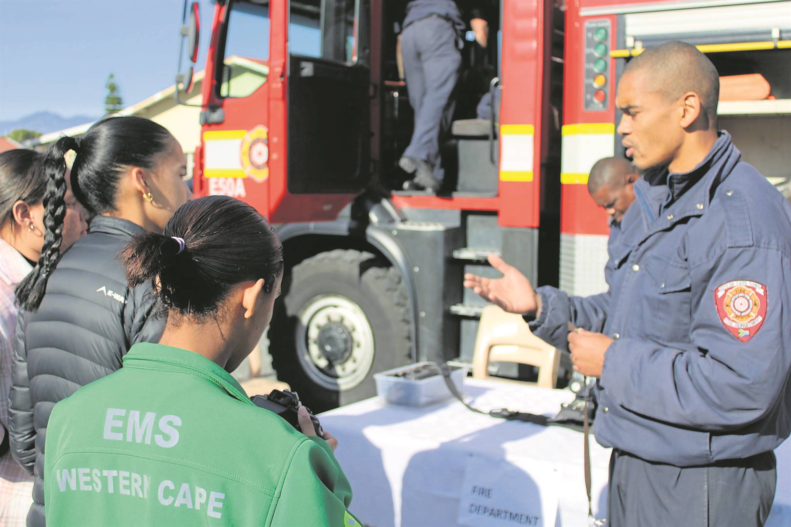 Helderberg firefighter Renaldo Duncan introduces some youngsters to the career of firefighting.