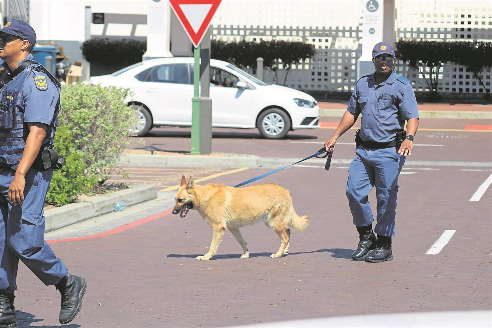 A policeman with a sniffer dog on scene at Somerset Mall where a bomb threat was reported on Tuesday 12 November.Photo: Yaseen Gaffar