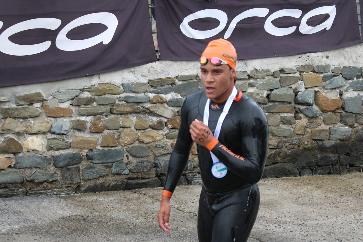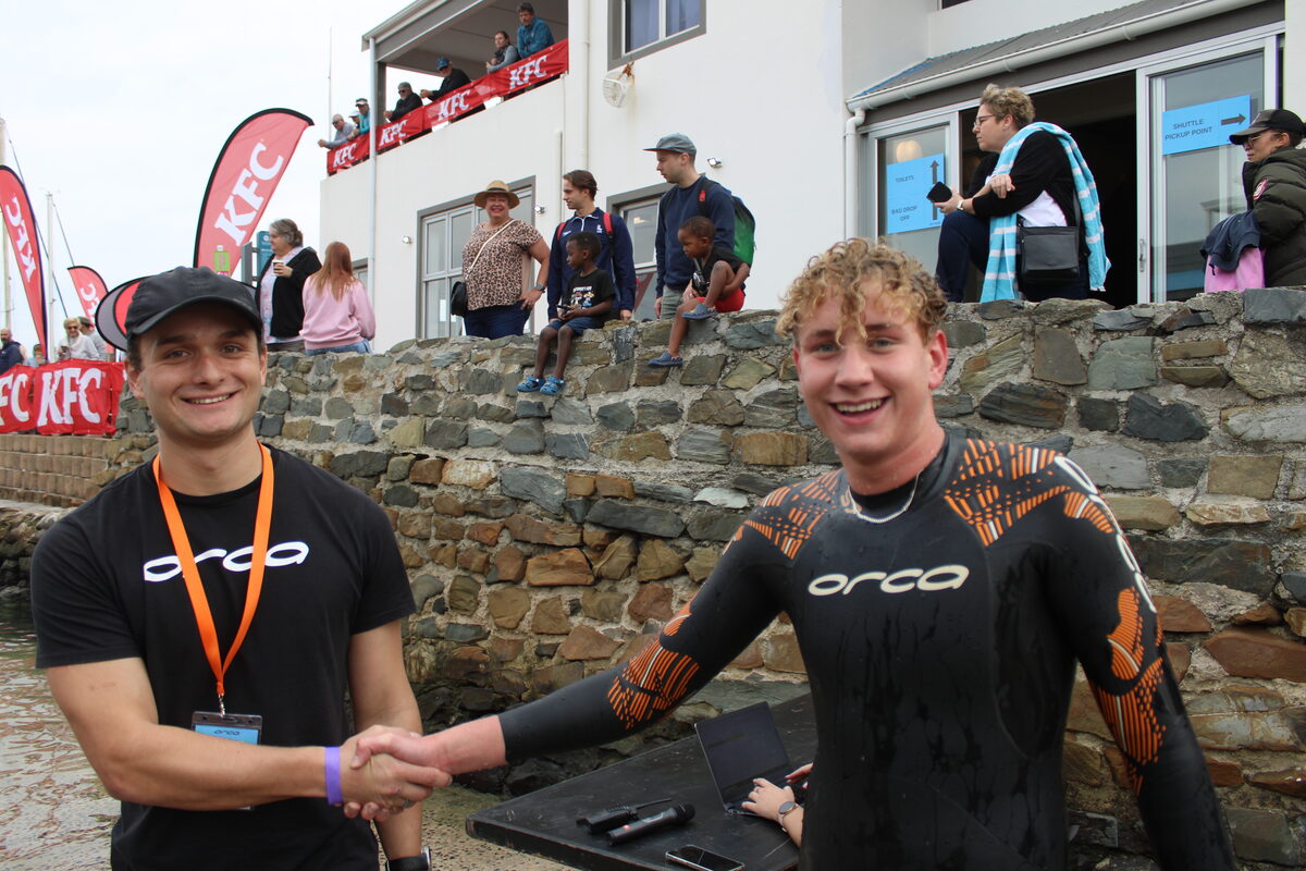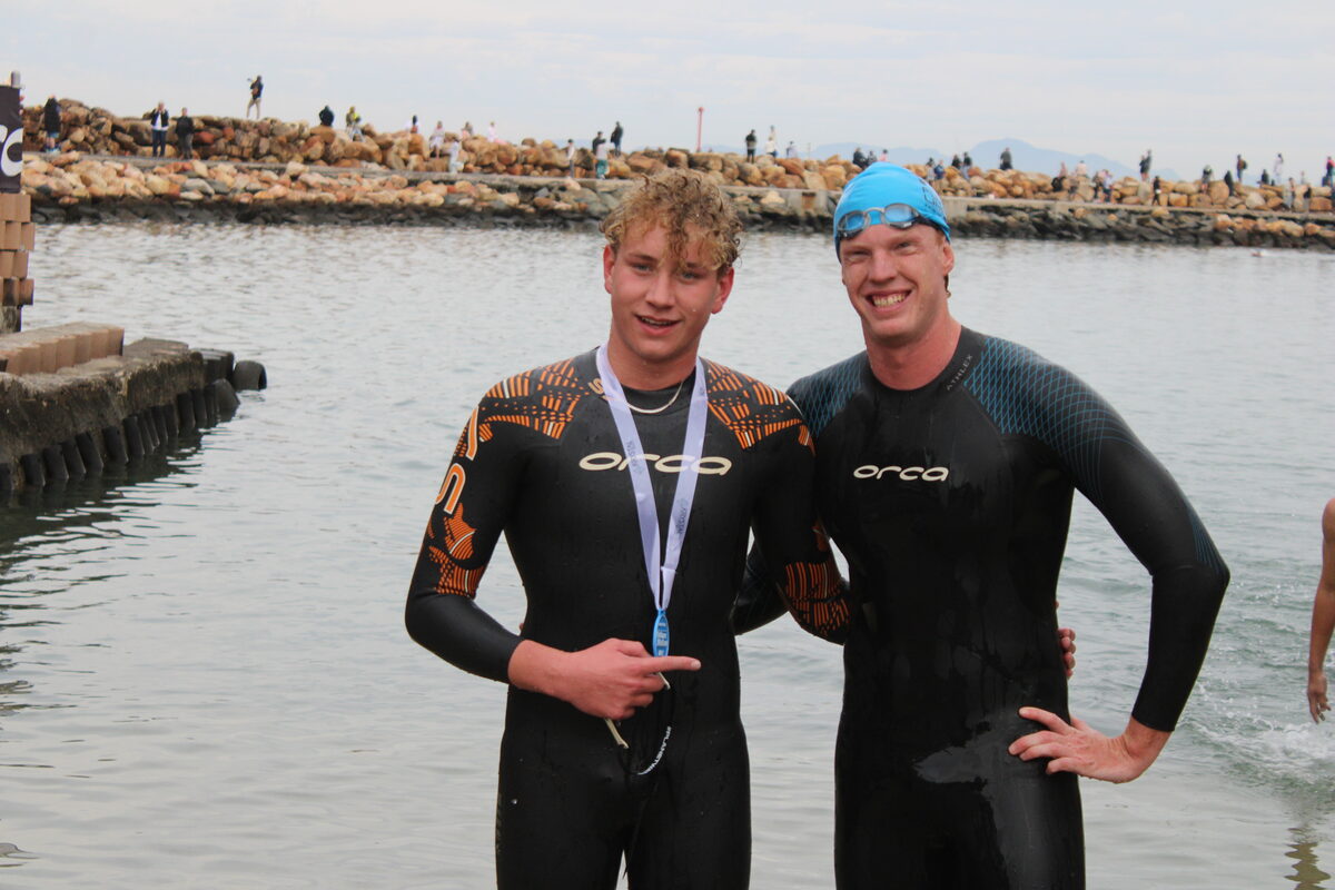 Andrew Wyatt congratulates Luan Terblanche, winner of the 1,6km swim in the junior male category.Robyn Phillips and Marguerite Faure were all smiles at the finish.Wade Beukes was among the first group of swimmers to finish the 1,6 km swim.Jessie Allot clinched third place in the junior female category.The first junior female out of the water in the 1,6 km swim, Maric De Roubaix.Wayne van Wyk finished second in the 1,6 km junior male category.Luan Terblanche and Thomas Klopstra, who emerged first and second respectively from the challenging 1,6 km open water swim .The Orca Harbour2Harbour was hailed as very well organised and was thoroughly enjoyed by all.