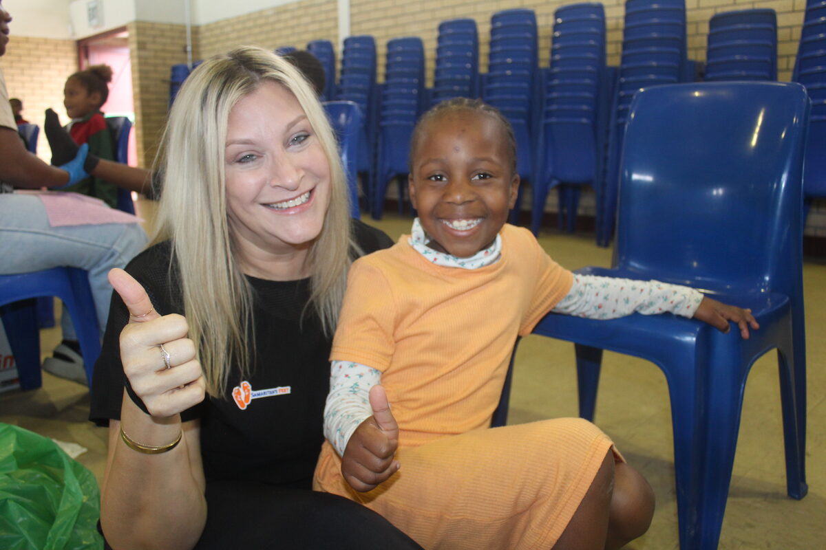 Tracie Ohonme, Samaritan’s Feet SA board member, connected with her new friend Beyoncรฉ Sisi, who enthusiastically gave her new shoes two thumbs up. The seven-year-old Grade 1 learner was sent on her way with a blessing and a smile.