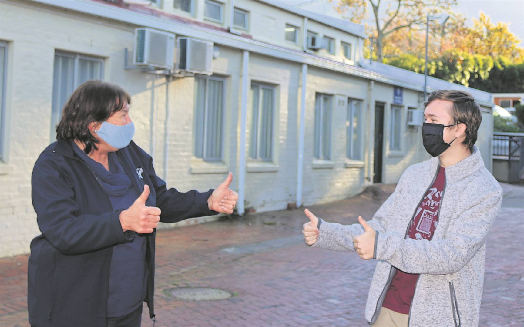 A total of 217 of Parel Vallei High School’s 232 Grade 12 learners reported back to school on Monday 1 June. The class of 2020 were urged not to become demotivated by the happenings in the world and remain aware of opportunities and keep their eyes focused on achieving the best matric results they possibly can. All grades in the school have also adapted in these trying times and teaching continues online via Microsoft Teams. Teacher Teresa Koekemoer and learner Daniel Christian ensured they kept a safe distance when they greeted one another.