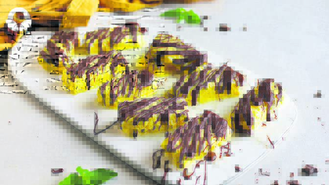 Daar is geen bykomende suiker nie, die natuurlike mango is soet genoeg, en is net die plesier wat jy hierdie somer nodig het. Hierdie mango-ysie is geskik vir diegene wat ’n vegan-leefstyl volg, dis glutenvry, en dit maak ’n gesonde, maklike nagereg. Die sjokolade wat in die vrieskas verhard word, is ’n moet en ’n bietjie gekapte neute is ook ’n goeie toevoeging.