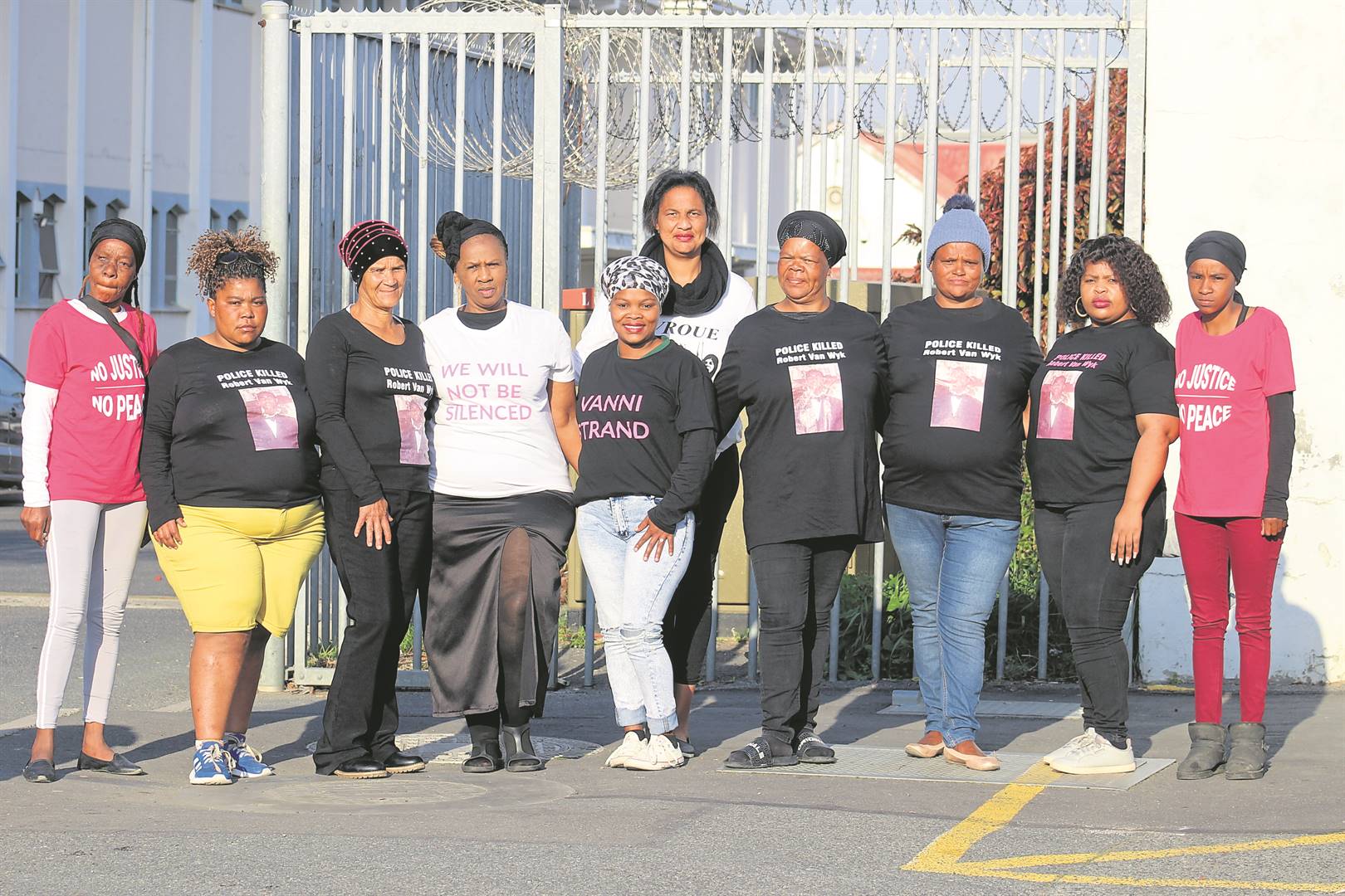 Lede van die Vroue in Aksie-beweging beloof om met elke hofverskyning van die beskuldigde in die moordsaak van Robert van Wyk in hul gedrukte T-hemde ter ondersteuning van sy eggenoot, Heibrey Jacobs (tweede, van links), by die Somerset-Wes-hof teenwoordig te wees. Dis ongeag die beskuldigde en sy regspan wat glo ’n bohaai oor die bewoording wil maak. Foto: Jamey Gordon