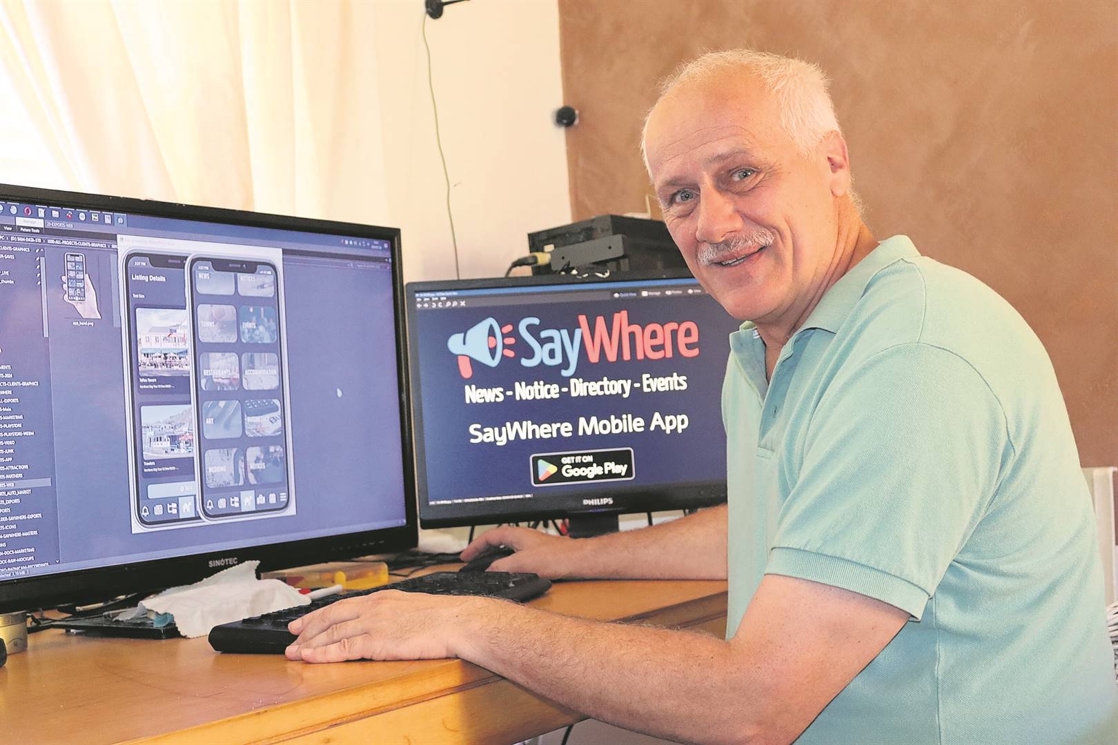 Sam Fourie (57), ’n inwoner van Gordonsbaai, het jare gelede verlief geraak op die internet en nadat hy lank as ’n webtuisteskepper asook ’n self-geleerde programmeerder gewerk het, het hy een van sy groot drome bewaarheid en die SayWhere Mobile App (toepassing) bekendgestel.