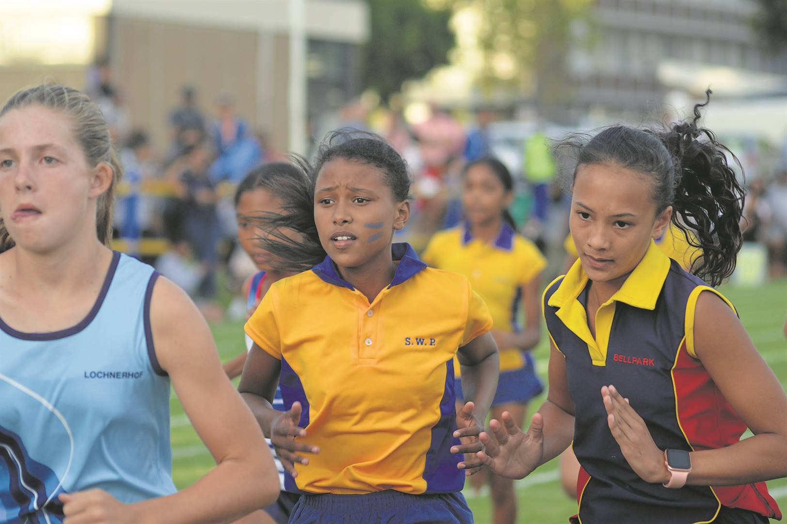 Kelsey Fanie toughing out the under-12 girls 600 m race while being challenged by Jani Barkhuizen of Lochnerhof and Lain Adams of Bellpark.Foto: