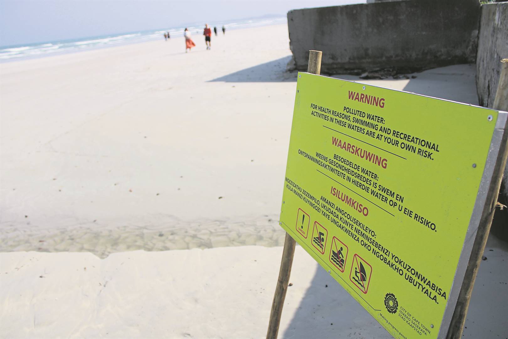 Signs put up at Strand Beach warn the public of polluted water.Photo: Yaseen Gaffar