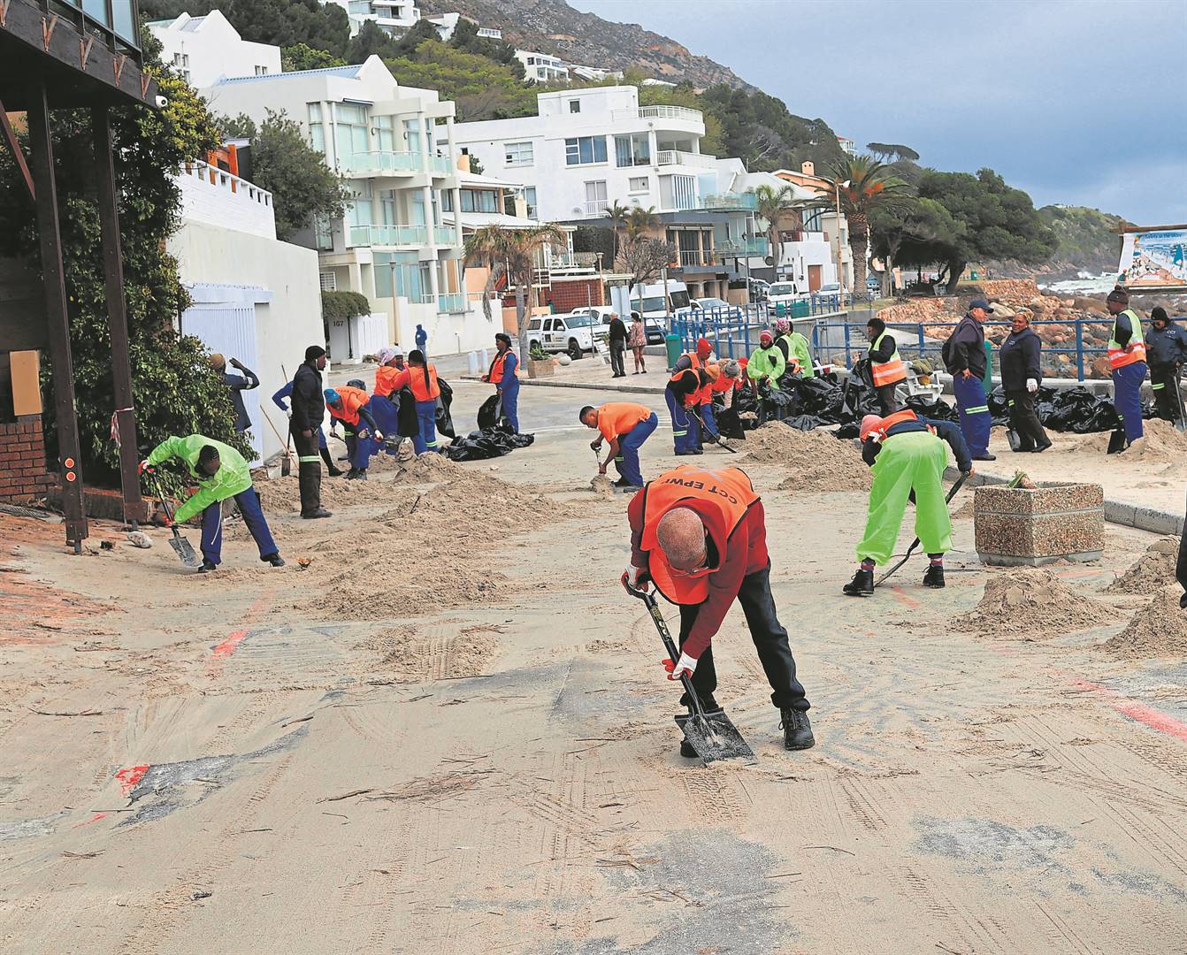 Die Stad Kaapstad se opruimingspanne besig om modder en sand skoon te maak wat agtergelaat is deur die groot golwe van die afgelope naweek. Foto: Rick Marais
