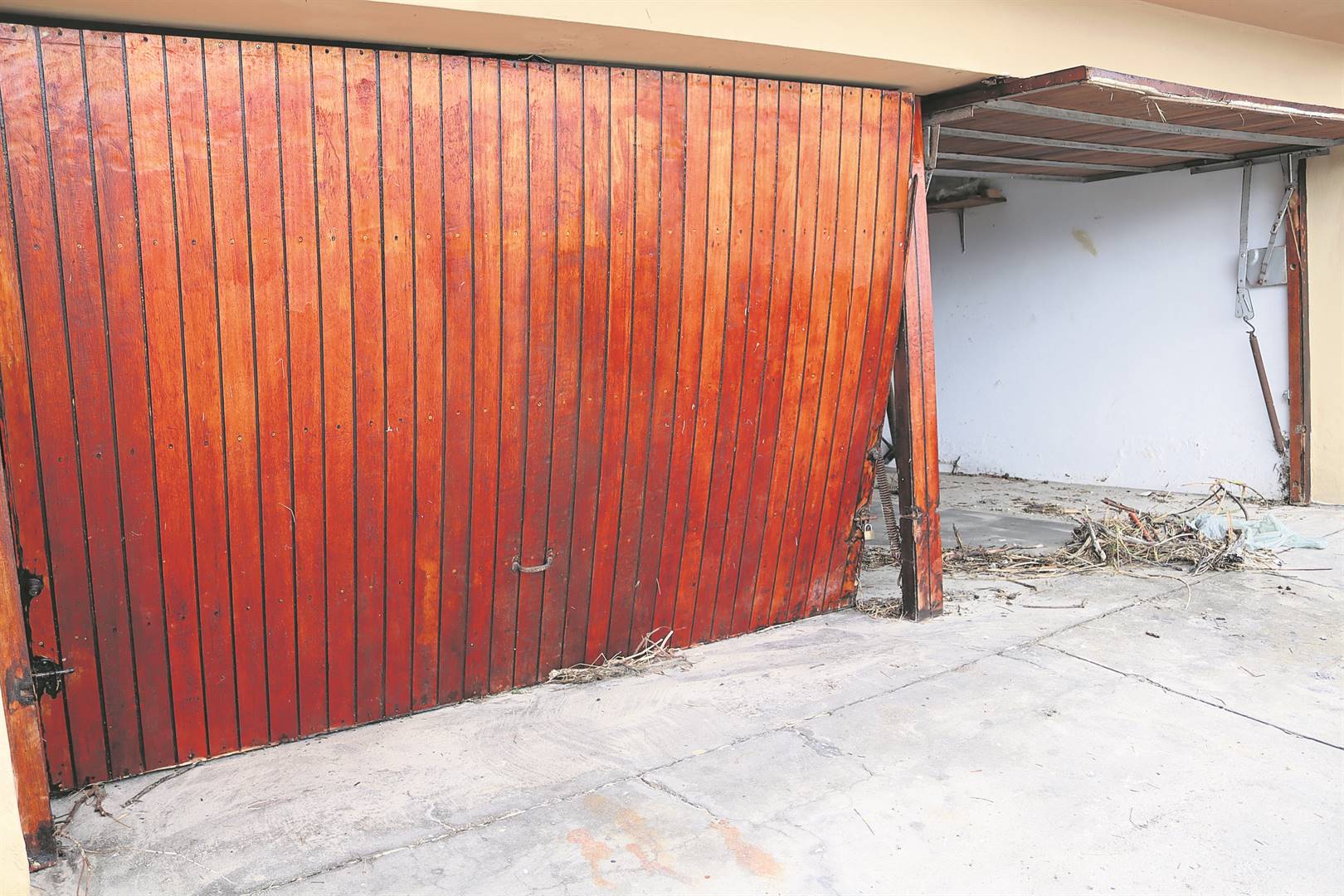 ’n Motorhuis deur in Bikini-strand is gebuig deur sterk golwe wat in van die huise in die gebied vasgeslaan het. Foto: Rick Marais