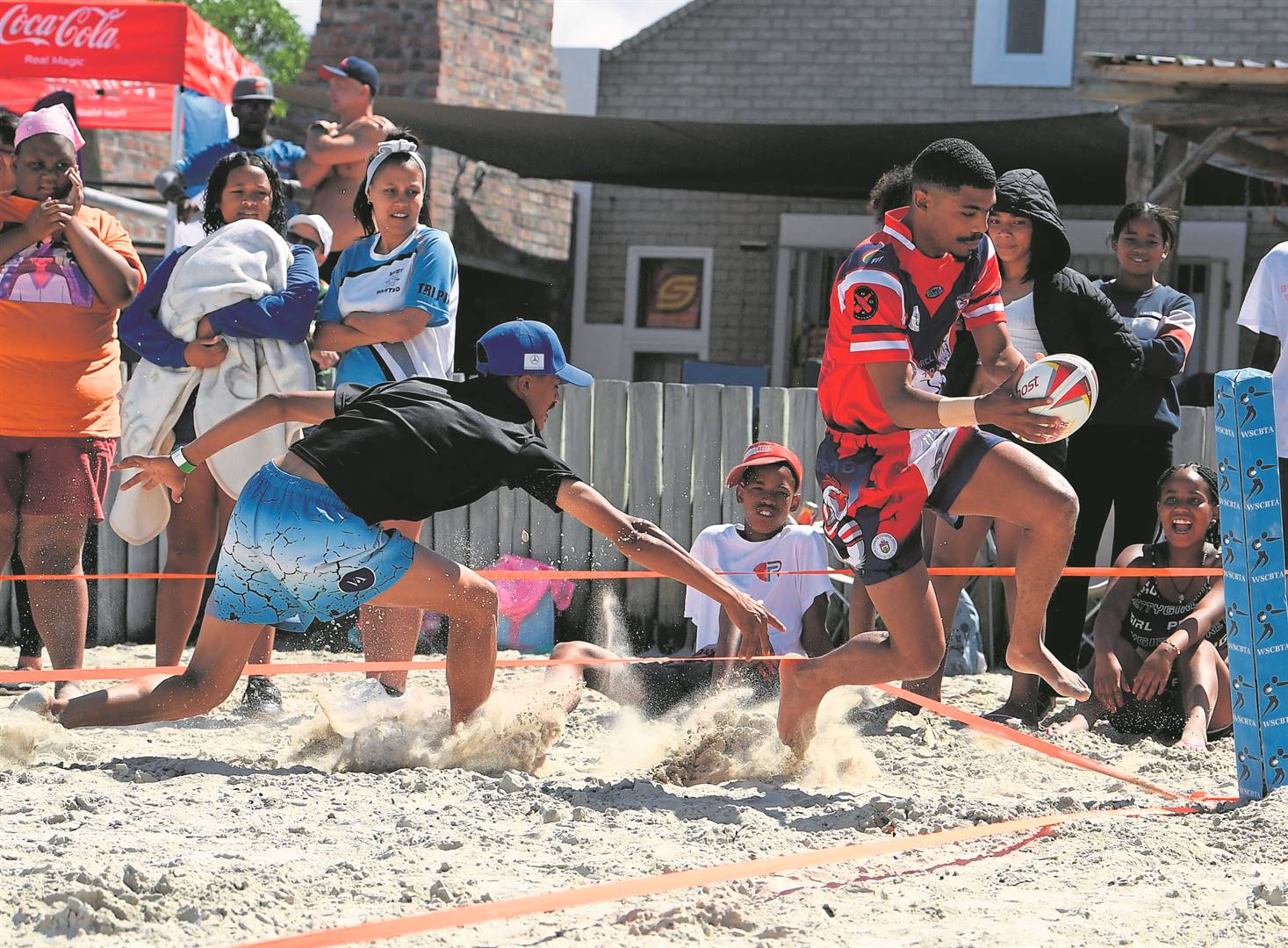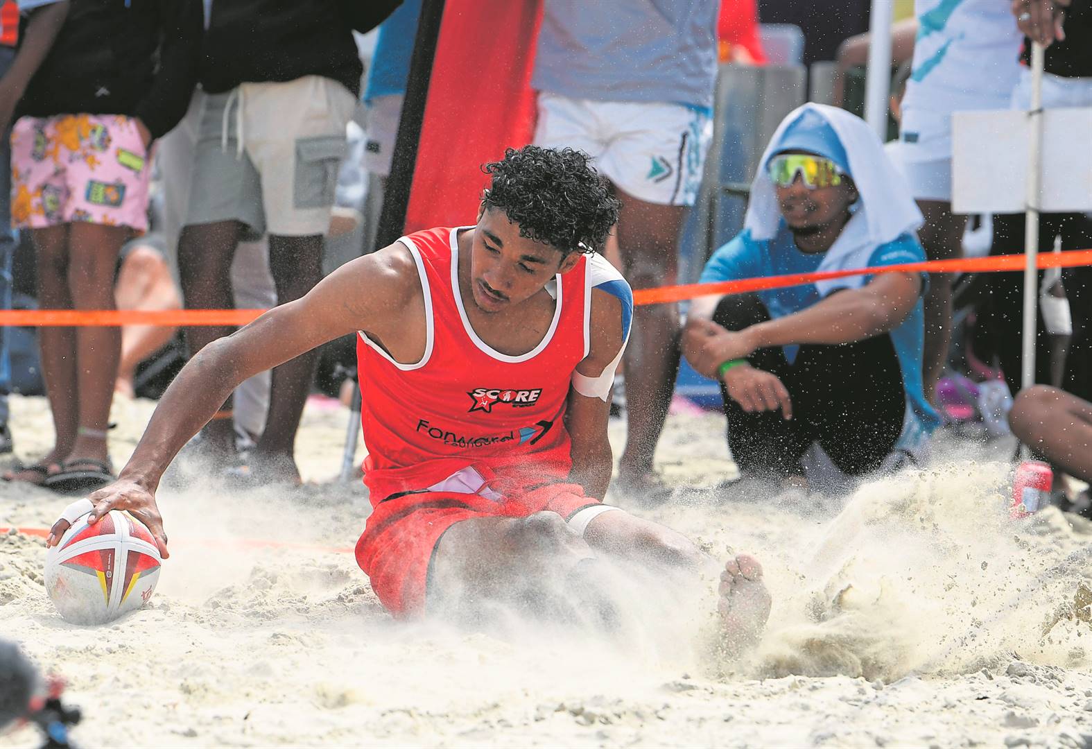 Cameron Tromp (Red) crosses the touchline for Barbarian Roosters.
