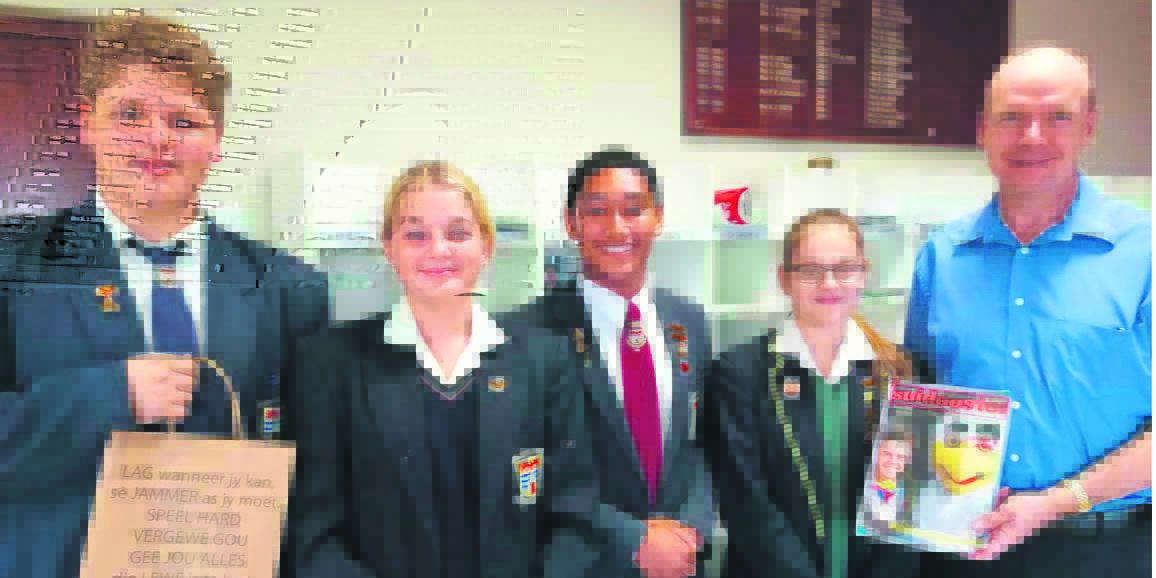 Hoërskool Strand se nuutste Suidooster-skoolkoerant is propvol lekkerlees-nuus oor die afgelope kwartaal se aktiwiteite. Die foto is by ’n oorhandigingsgeleentheid van die koerant geneem. Bo is Jean le Roux (hoof van die bladuitleg-span), Michelle Pio (bladuitleg), Ronado Phillips (subredakteur), Michelle Olivier (redakteur) en Danie Malan, hoof van Hoërskool Strand. Die aanlynkoerant is op die skool se webblad beskikbaar.Foto: