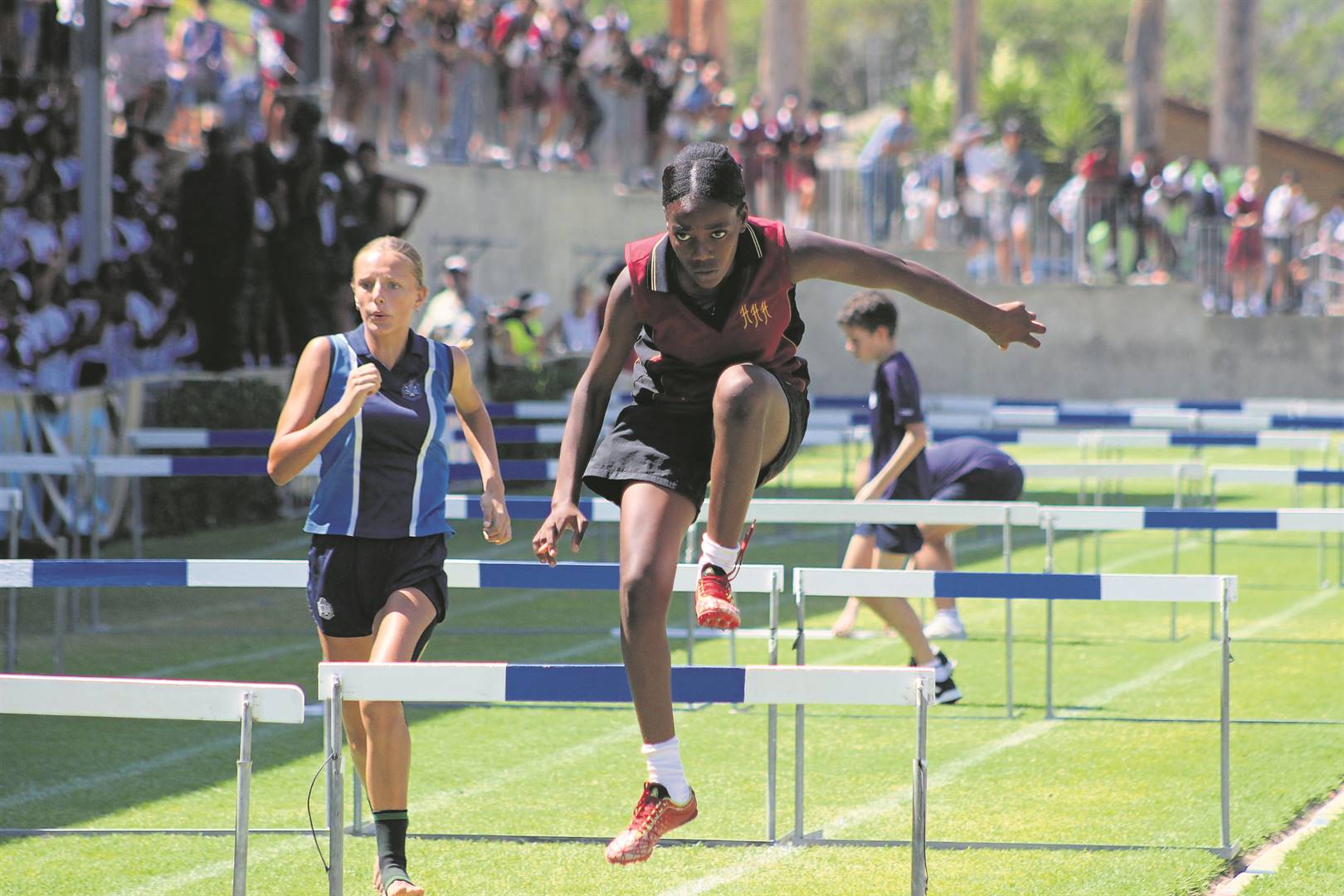 Bianca Chadzamira gets airborne as she soars over a hurdle in the under-15 girls track event.