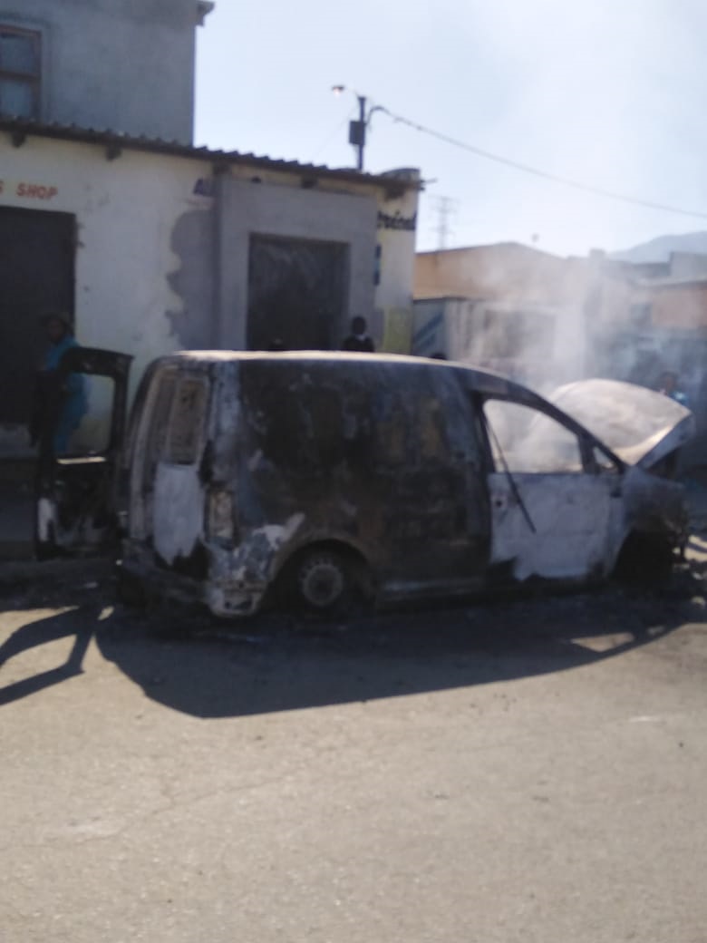 According to a Strand police report, the complainant allegedly dropped a colleague at the side of the road when a large group of pedestrians ran toward the vehicle, hurling stones at the white Nissan NP200 bakkie. The complainant took the keys and exited the vehicle moments before it was set alight. The vehicle was gutted along with the complainant’s HP laptop and iPhone which was still inside.