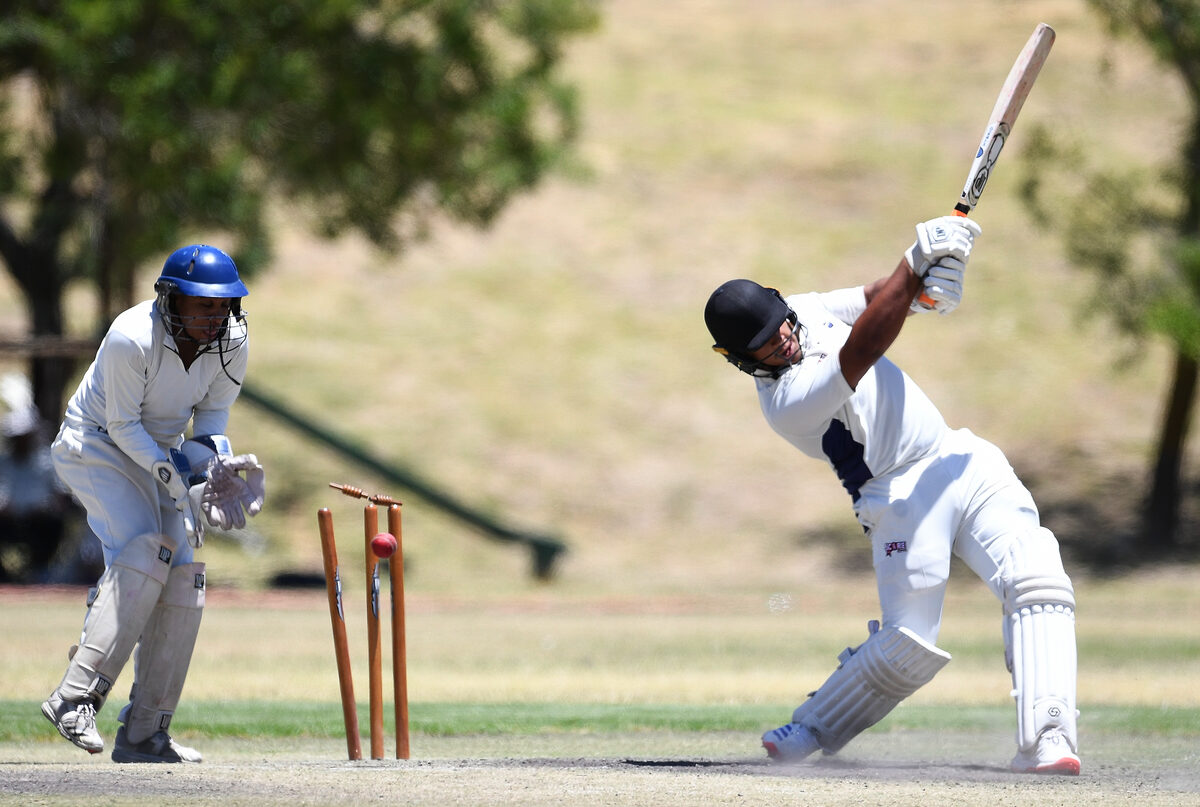 Somerset West batsman Jason Lee Josephs loses his stumps while going for big hit.