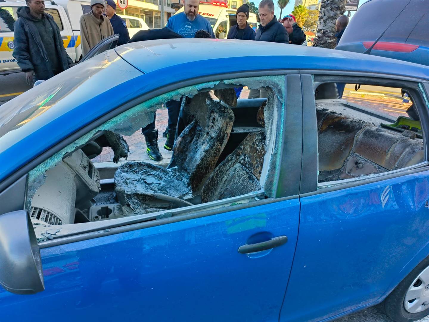 Owerhede op die toneel waar ’n motor vroeër vanoggend (Sondag 27 Augustus) in Kusweg, Strand, in vlamme uitgebars het. Die voorval het in ’n parkeerterrein oorkant die munisipale swembad afgespeel en ’n Volkswagen Polo van binne uitgebrand. Foto’s: J’andre Conradie