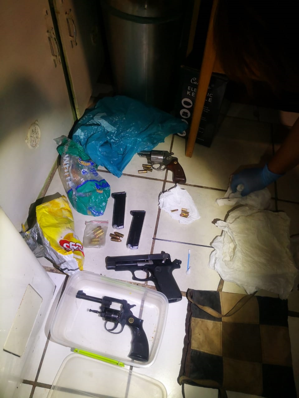 Hoewel die provinsiale polisiewoordvoerder sersant Wesley Twigg nie veel oor die saak wou uitbrei nie omdat die omstandighede oor die voorval deel is van die polisieondersoek, het hy bevestig ’n 49-jarige manlike verdagte is Saterdag 13 Januarie met gesteelde, onwettige vuurwapens in sy besit betrap en deur die polisie se teenbende-eenheid in hegtenis geneem. “Die teenbende-eenheid het ná ’n inbraak by ’n huis in Gordonsbaai inligting opgevolg en op ’n adres in Abattoirstraat, Strand, toegeslaan, waar hulle die woning deursoek en twee rewolwers en ’n pistool asook ammunisie gekry het.”