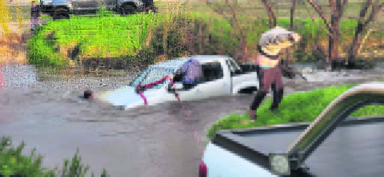 Ná mislukte pogings om te keer dat die voertuig onder die water verdwyn, het die insittendes daarin geslaag om die bakkie, wat deur die stroom meegesleur is en byna heeltemal ondergedompel was, op die nippertjie te ontruim. Die paartjie het tot by die wal na veiligheid gespartel en op hulp gewag.