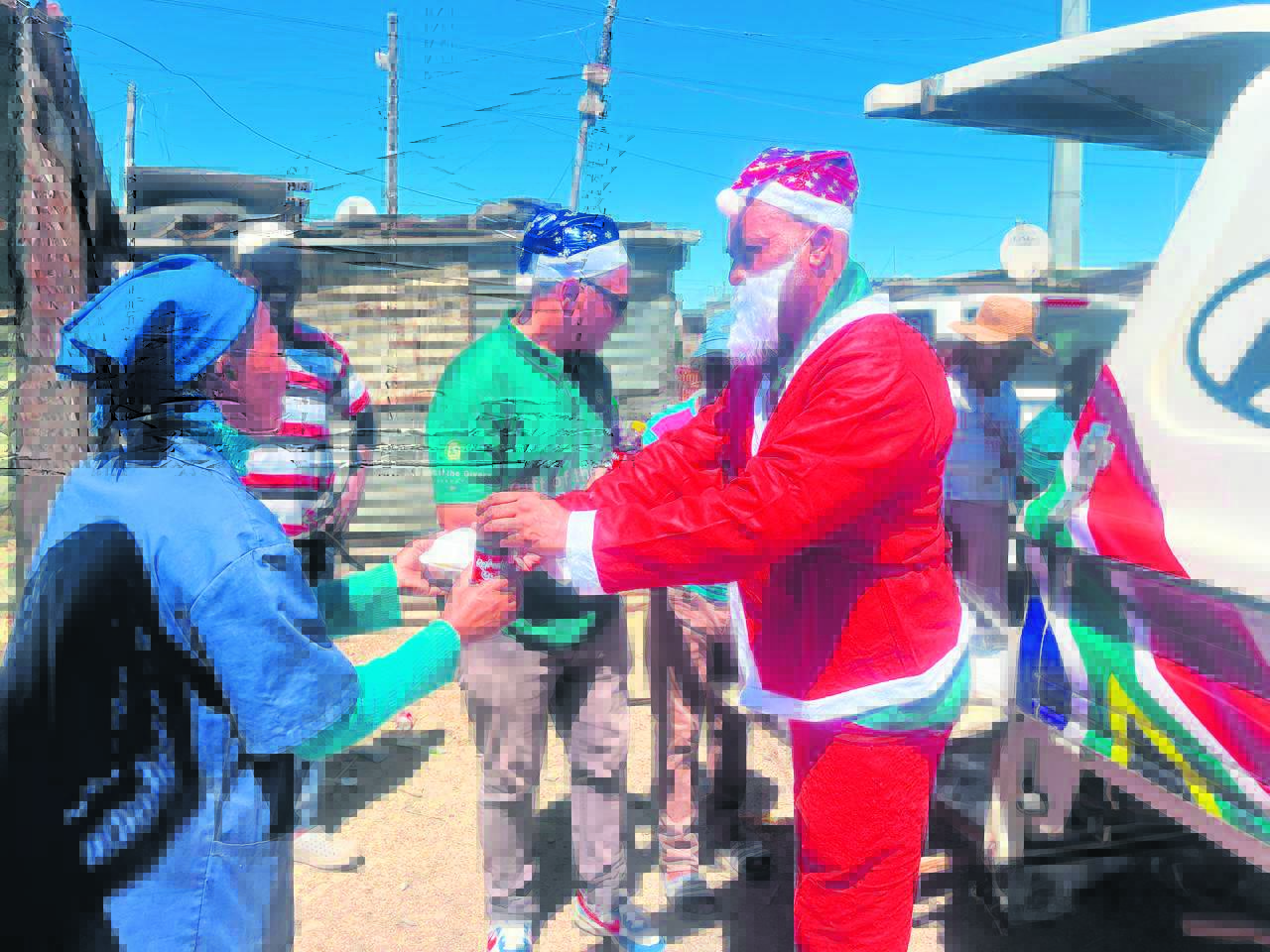Wahied Karriem from Gift of the Givers plays Santa, handing out meals to displaced residents.