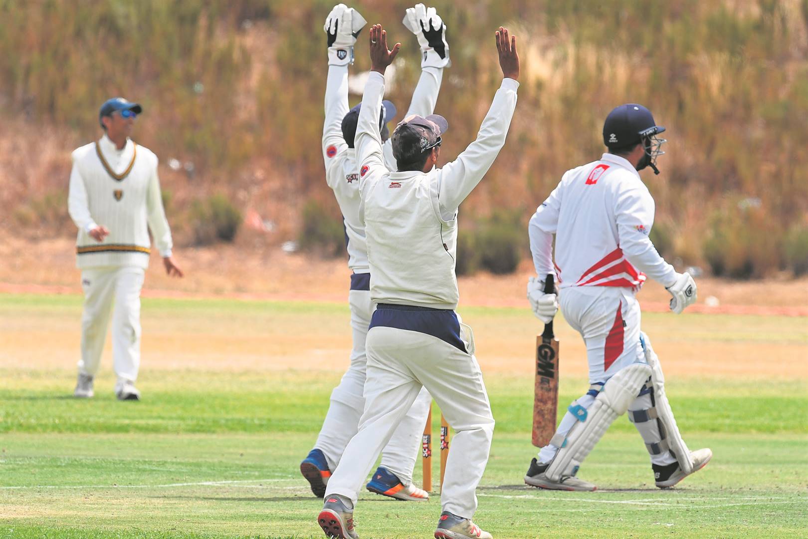 Larry Morkel and wicketkeeper George Hlazo (obscured) of SWCC appeal for a LBW.