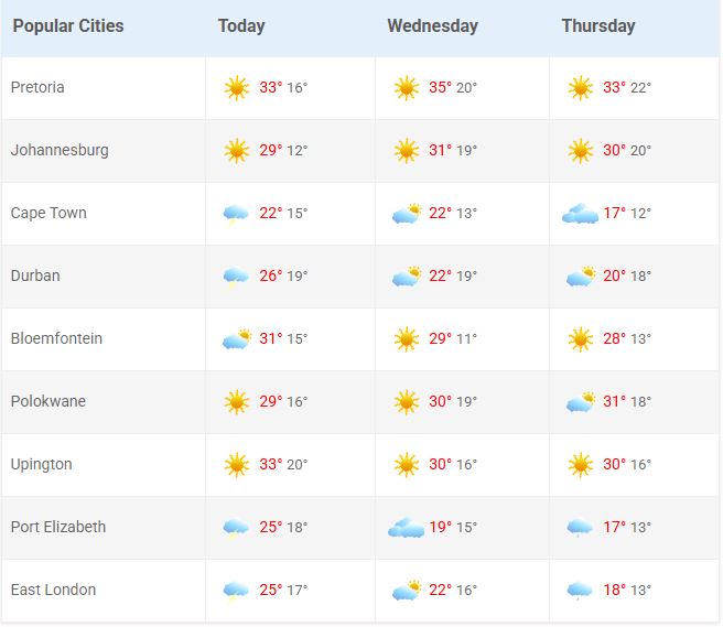 The South African Weather Service’s three-day weather forecast. Credit: https://www.weathersa.co.za/