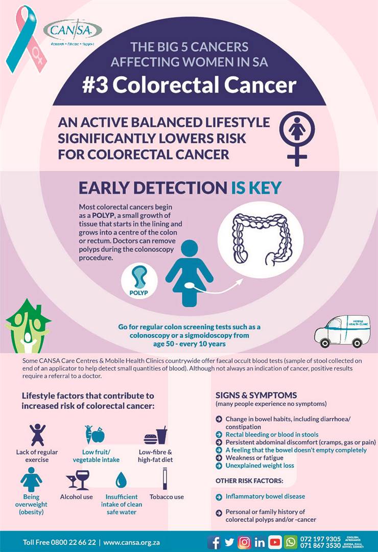 Colorectal cancer (also known as colon cancer) awareness is being campaigned by Cansa during April, and its key messages align with the theme of World Health Day, which was held on Sunday (7 April).