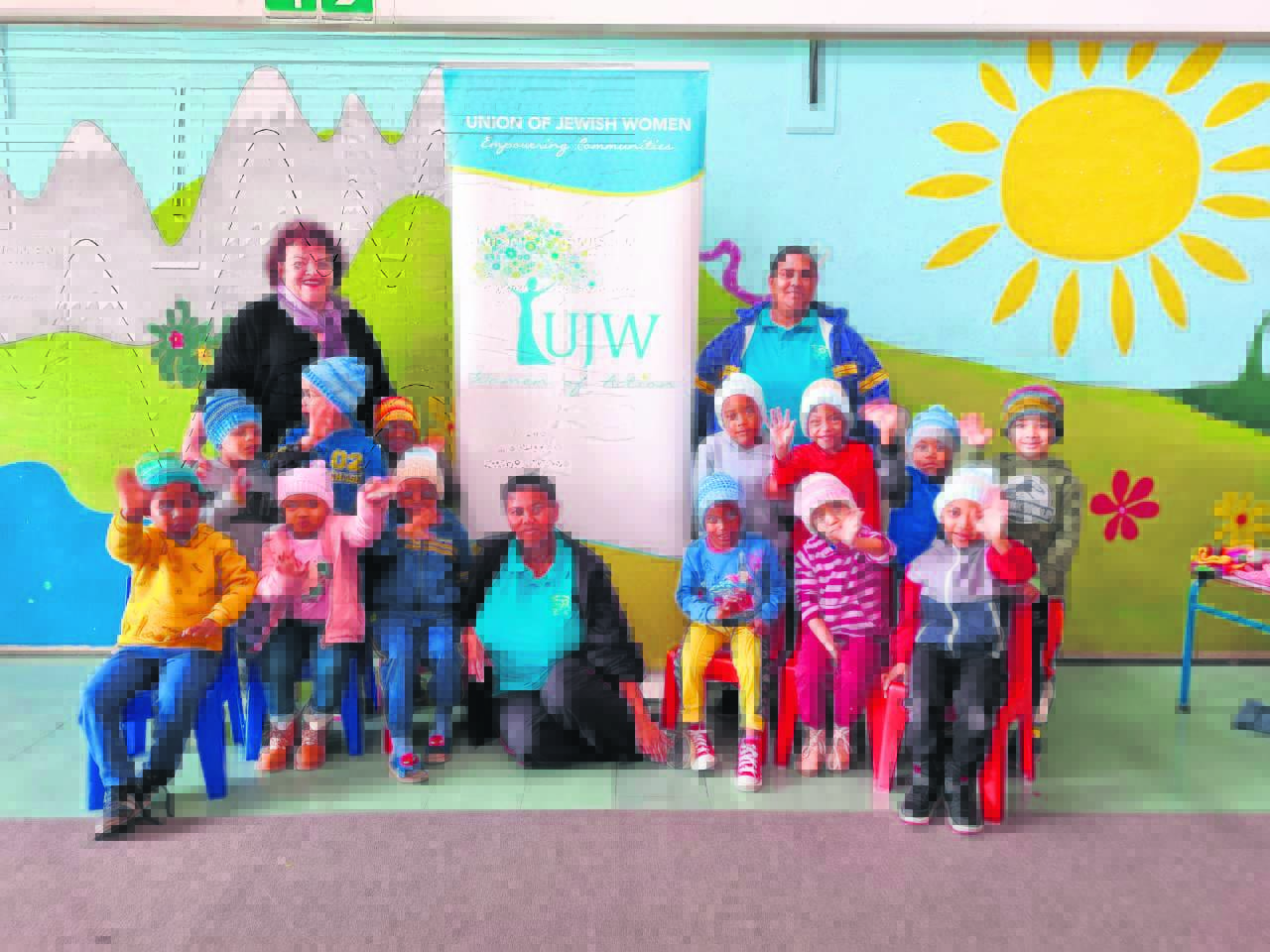 Ida Jacobson (left back), a member of the Union of Jewish Women, resident of Stellenbosch and who is known to be a caring and passionate community leader, knitted more than 100 beanies which she donated to learners at Nora Tyers Crèche in Cloetesville. She also provided them with a warm meal and thoroughly enjoyed spending the morning with the staff and learners at the school in celebration of Mandela Day. The children responded in song and dance as a way of expressing their appreciation for this special gesture. With the youngsters and Jacobson are Madalene Smith (teacher) and Estelle Jacobs (principal, right).