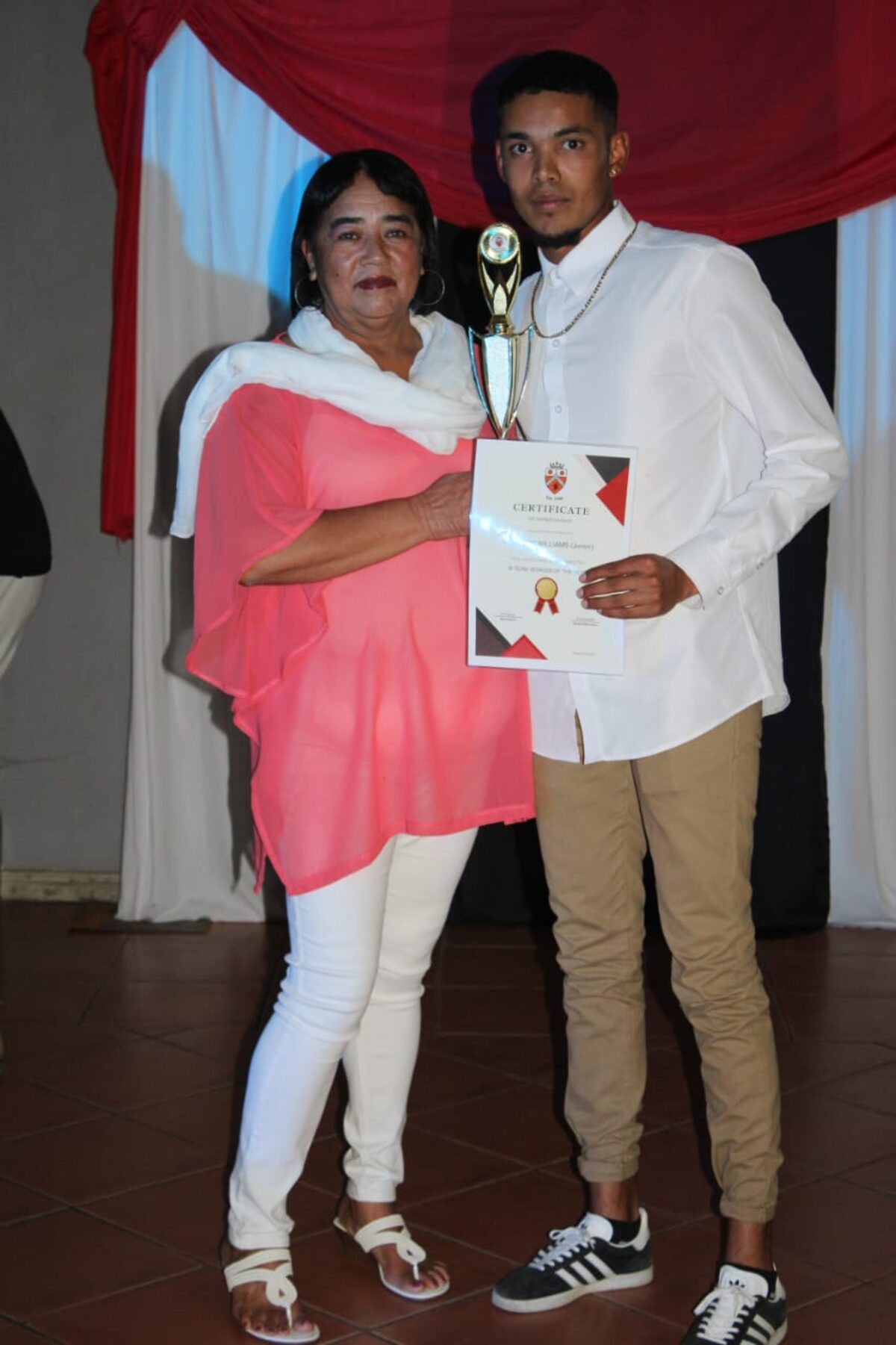 speler aan Charl Cyster.Kiano Valentine ontvang die prys as die beste bouler van die jaar by Evadney Denyssen.Die veterane Angus Simmers (links) en Charles Denyssen is vir hul
