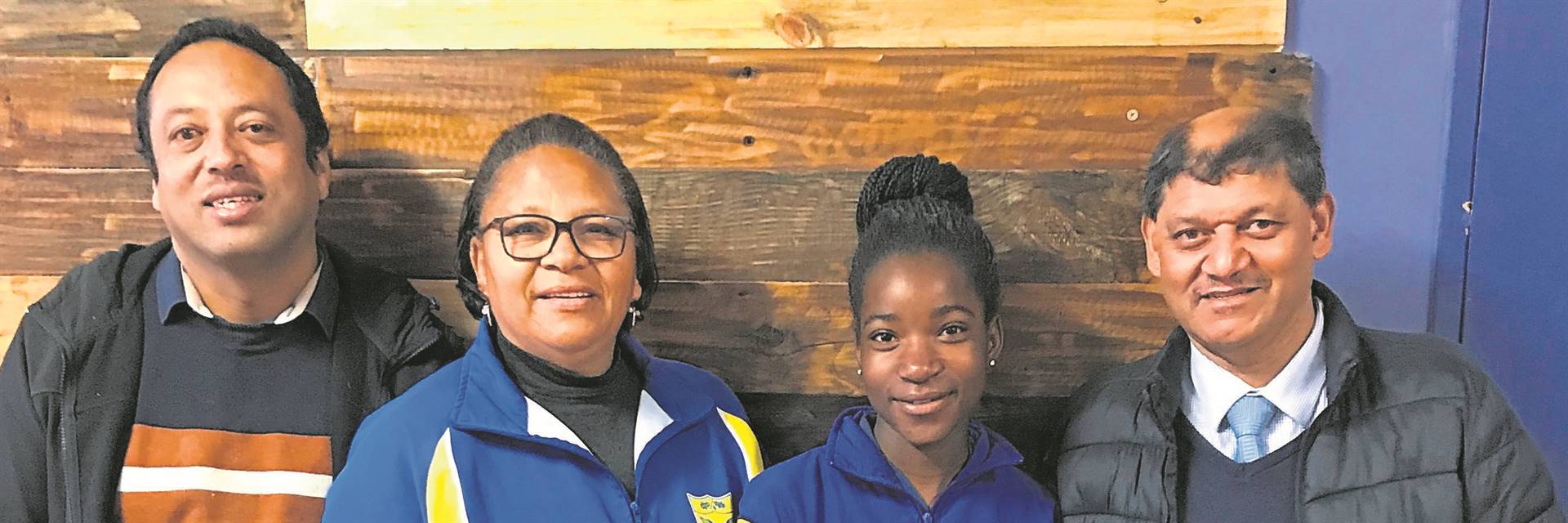 Alicia Mutangiri (tweede van regs) van die Idasvallei Primêre Skool het onlangs haar Boland-kleure in landloop verwerf. By haar is van die skool se trotse personeel: Johan February, Hajierah Timmey en Richard Williams (hoof).