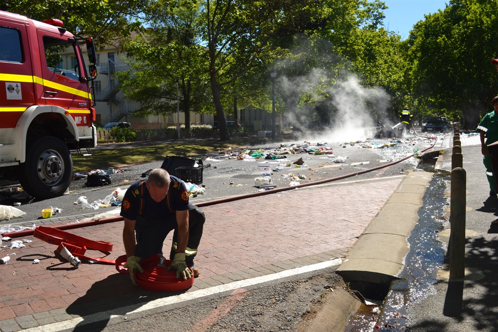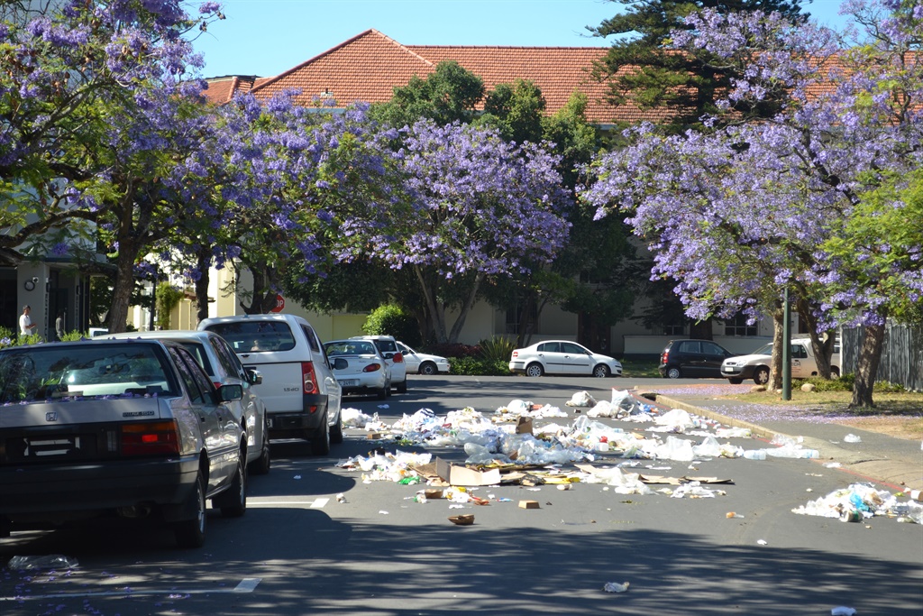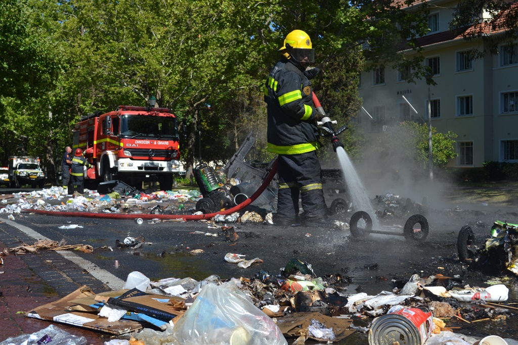 Gebrande dromme en rommel is orals in Victoriastraat te sien soos werkers by Universiteit Stellenbosch hul betoging teen uitkontraktering hervat.