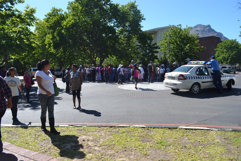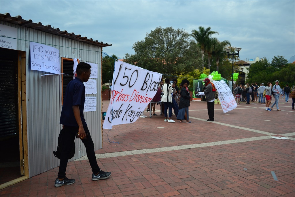 So het betogende werkers op ‘n Eikestadnuus-verslaggewer geskree toe sy foto’s van die toneel op Universiteit Stellenbosch (US) se kampus probeer neem het.