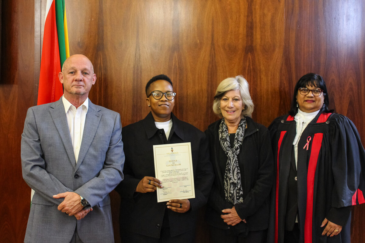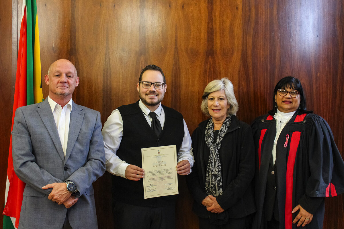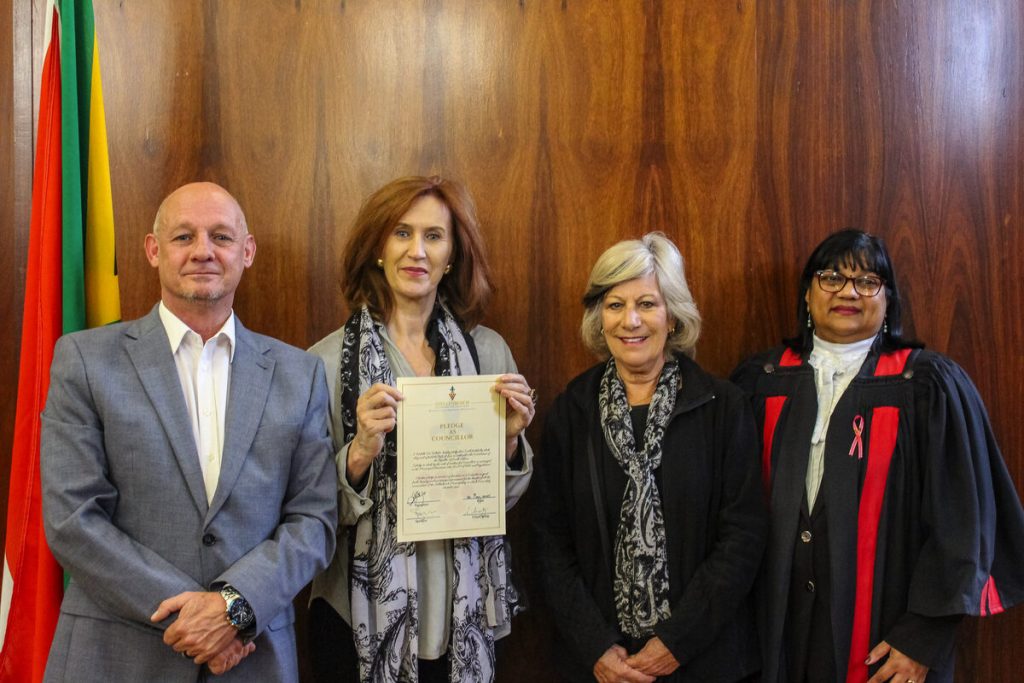 Die Stellenbosch- munisipale raad het vandeesweek drie nuwe raadslede verwelkom – met ‘n bekende gesig in die groep. Die Demokratiese Alliansie (DA) se Zintle Olayi en haar nuwe kollega, Isabelle de Taillefer , is deur die speaker, Quintin Smit, en die hoofsweep, Patricia Crawley, verwelkom. By die verrigtiginge en saam met die beamptes is landdros Maya Prag. Olayi is nou ‘n proporsionele raadslid terwyl De Taillefer wyk 9 verteenwoordig. Olayi vervang ontslape raadslid Xolile Kalipa wat vroeër vanjaar oorlede is. De Taillefer op haar beurt het die pos van Zelda Dalling ingeneem nadat dié bedank het. De Taillefer was voorheen proporsionele raadslid vir die Vryheidsfront Plus (VF+), maar het bedank en oorgeloop na die DA. Sy was verkies tydens ‘n onlangse tussenverkiesing en haar ou posisies is nou deur JC MacFarlane (foto regs) vir dié party gevul.